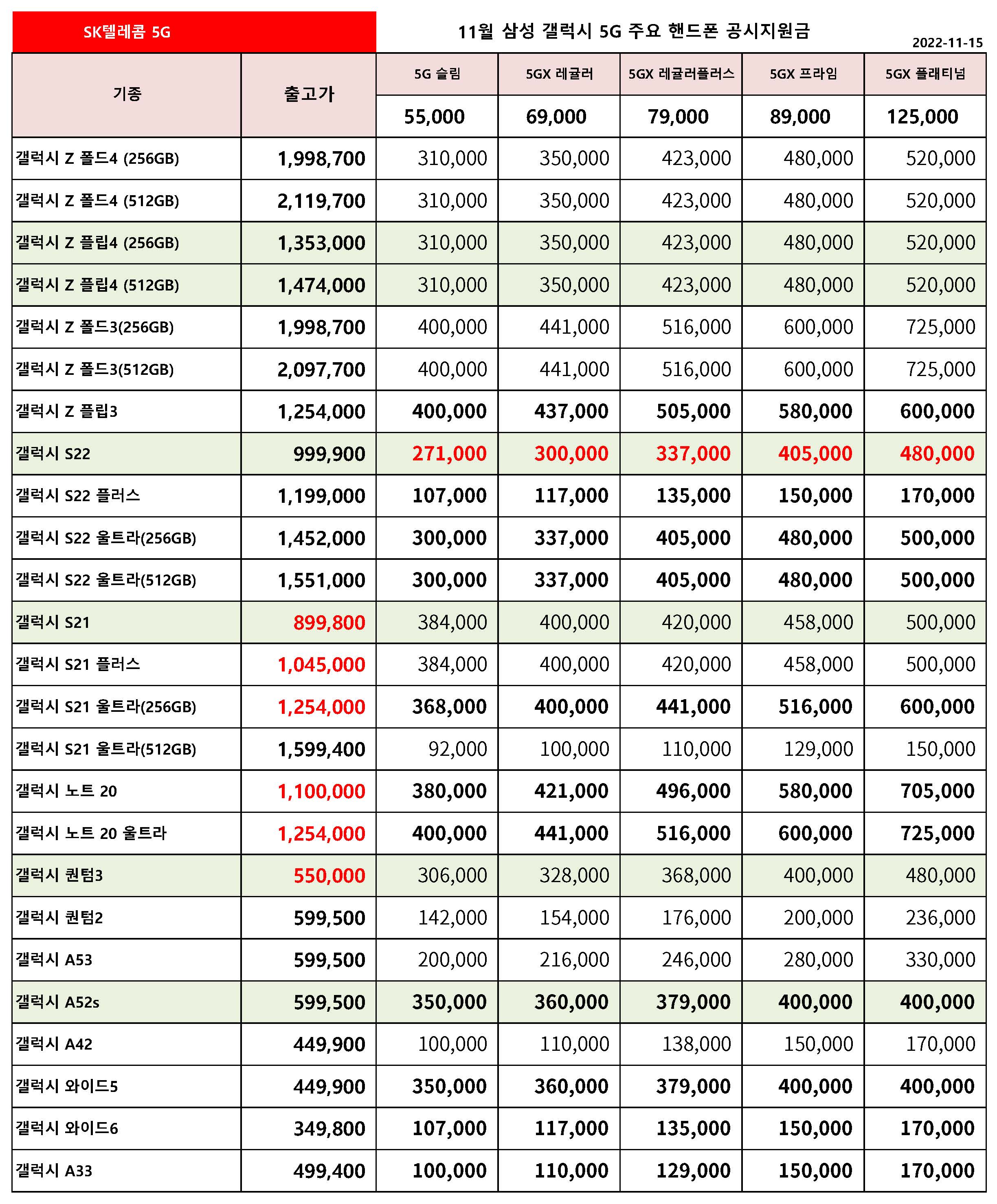 * 갤럭시 S22 - 공시지원금 상향 ( 내렸던 공시지원금 복귀)
