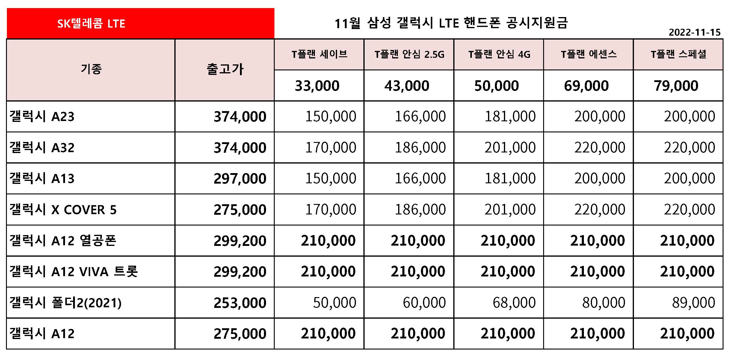 11월 SK텔레콤 주요 핸드폰 공시지원금 정리 포스팅 입니다.