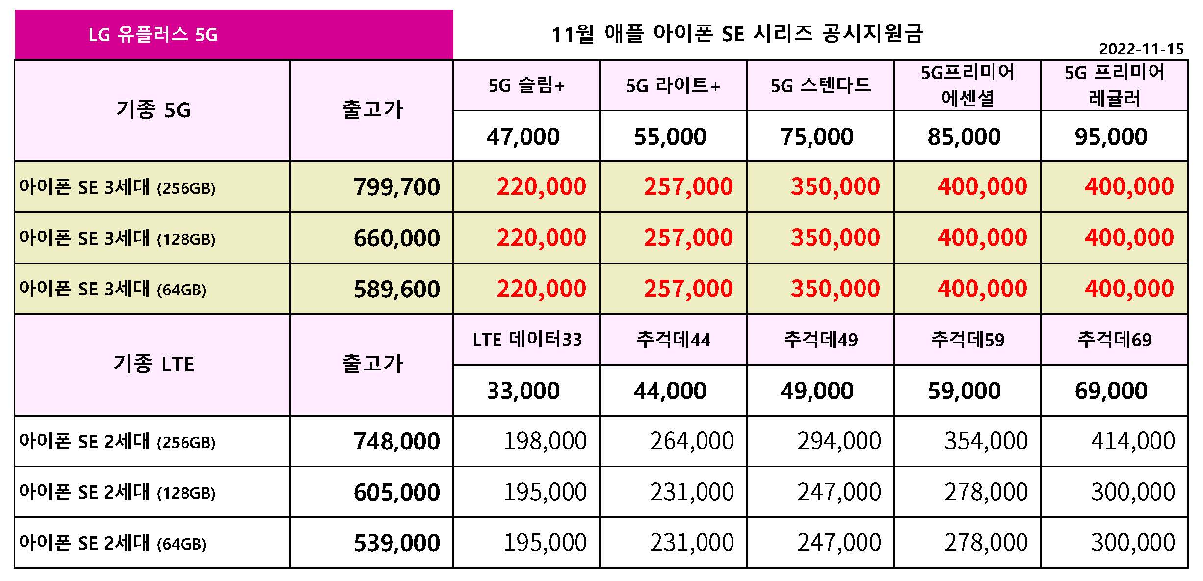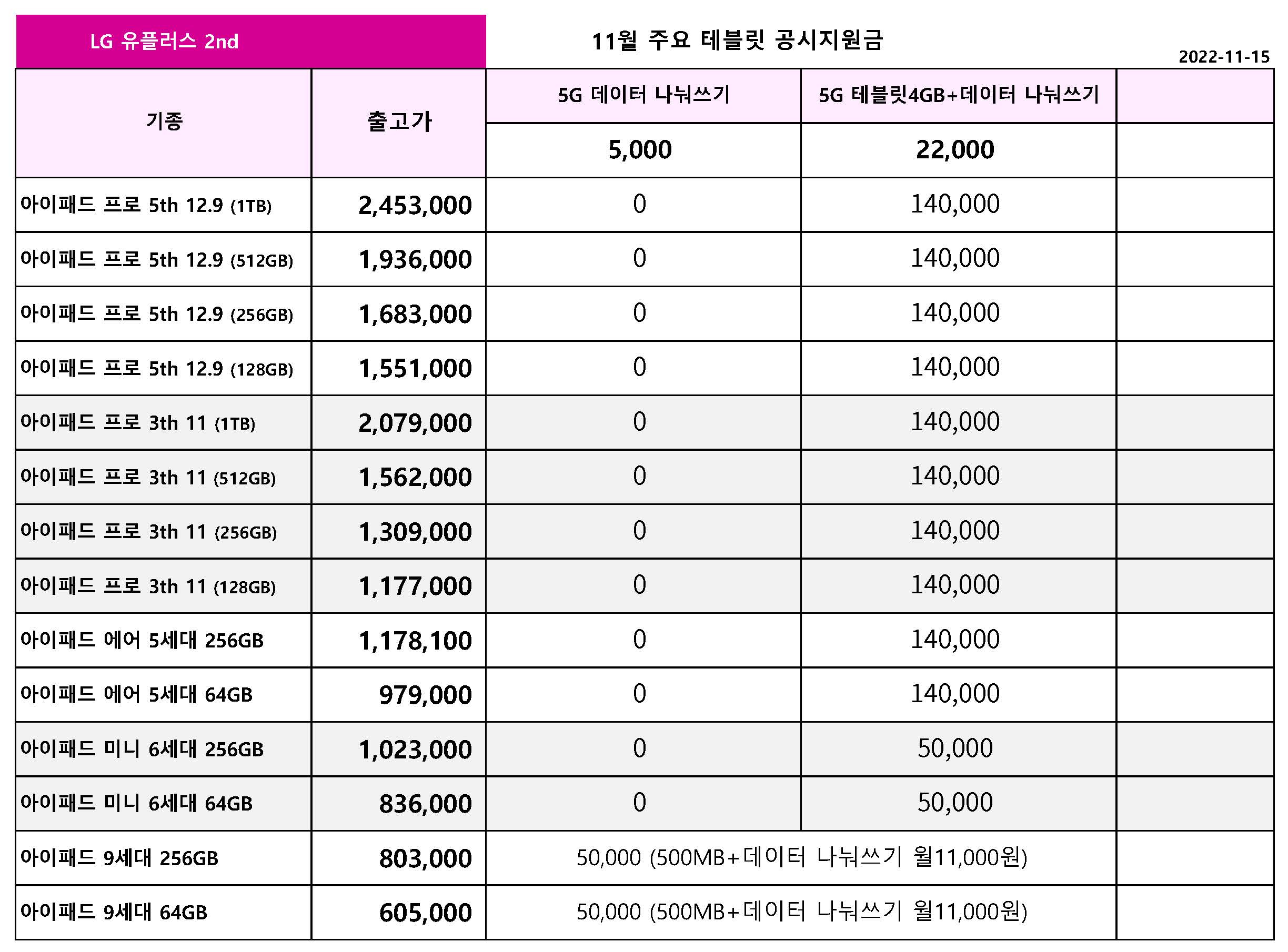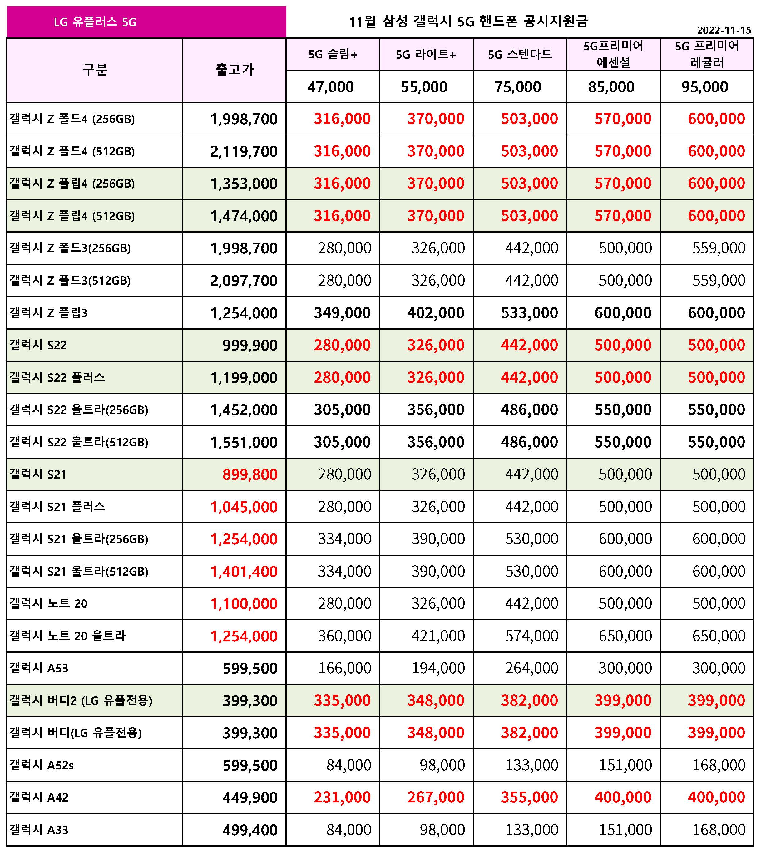 11월 LG 유플러스 주요 핸드폰 공시지원금 정리
