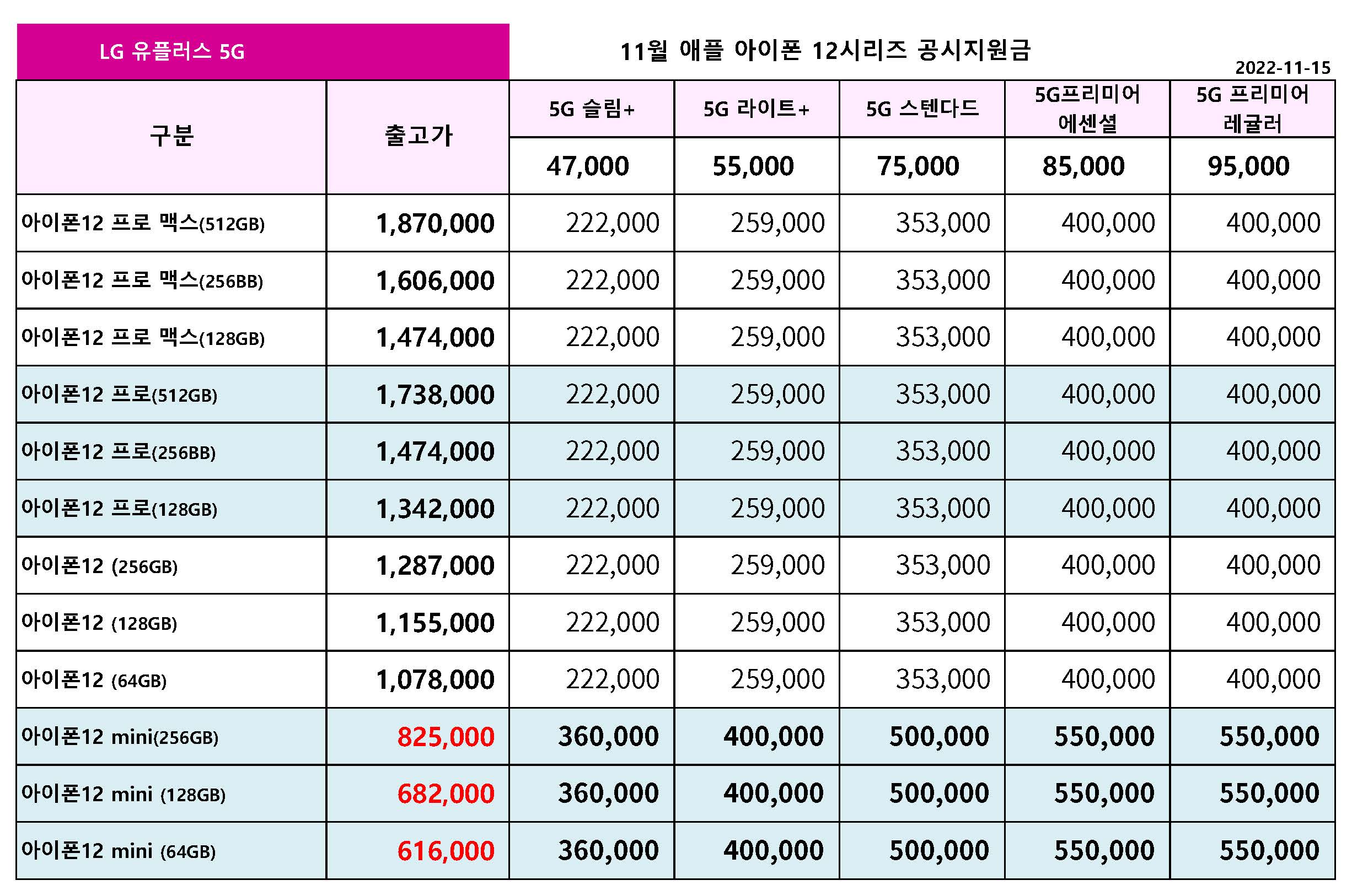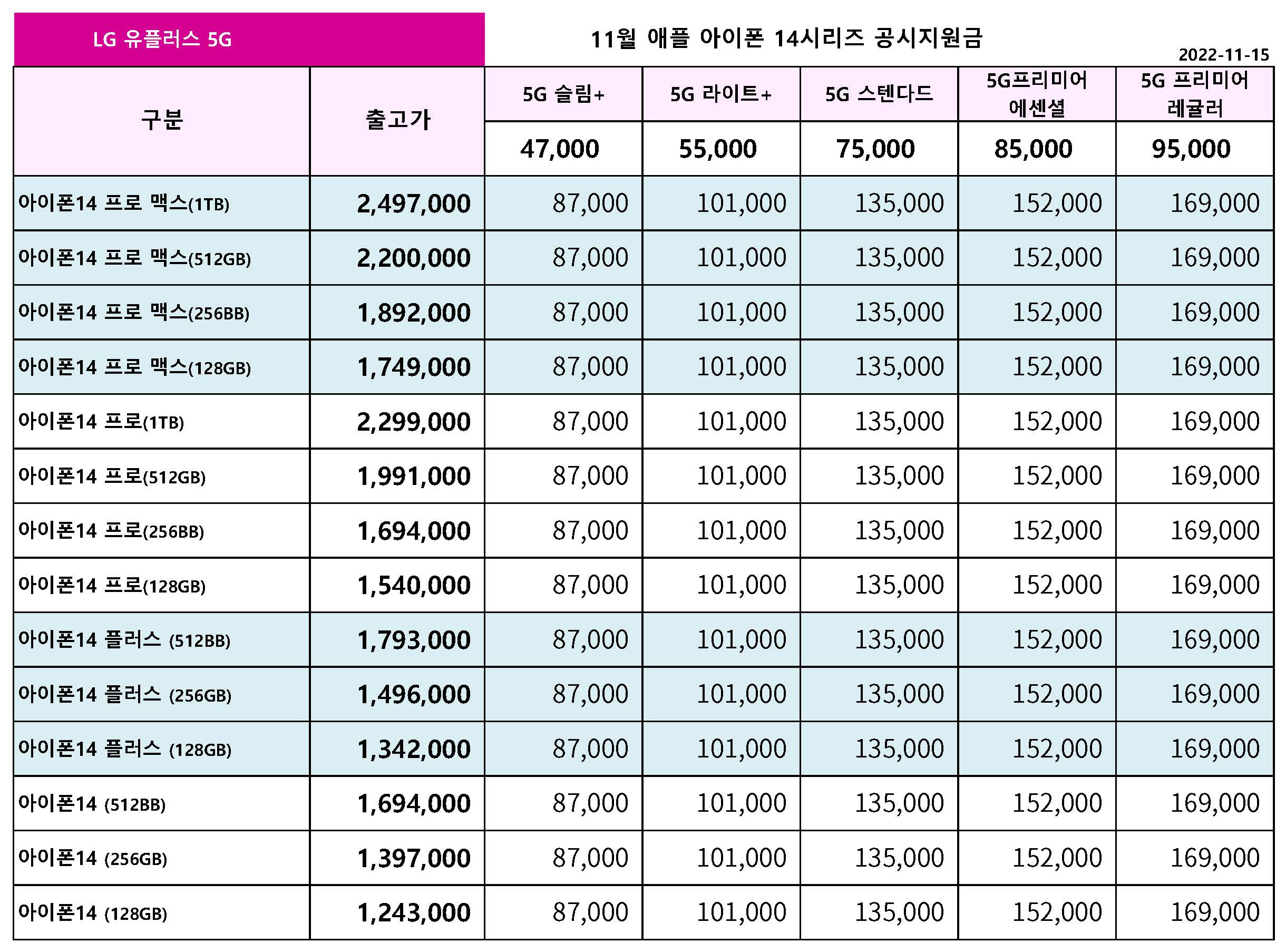 11월 LG 유플러스 주요 핸드폰 공시지원금 정리
