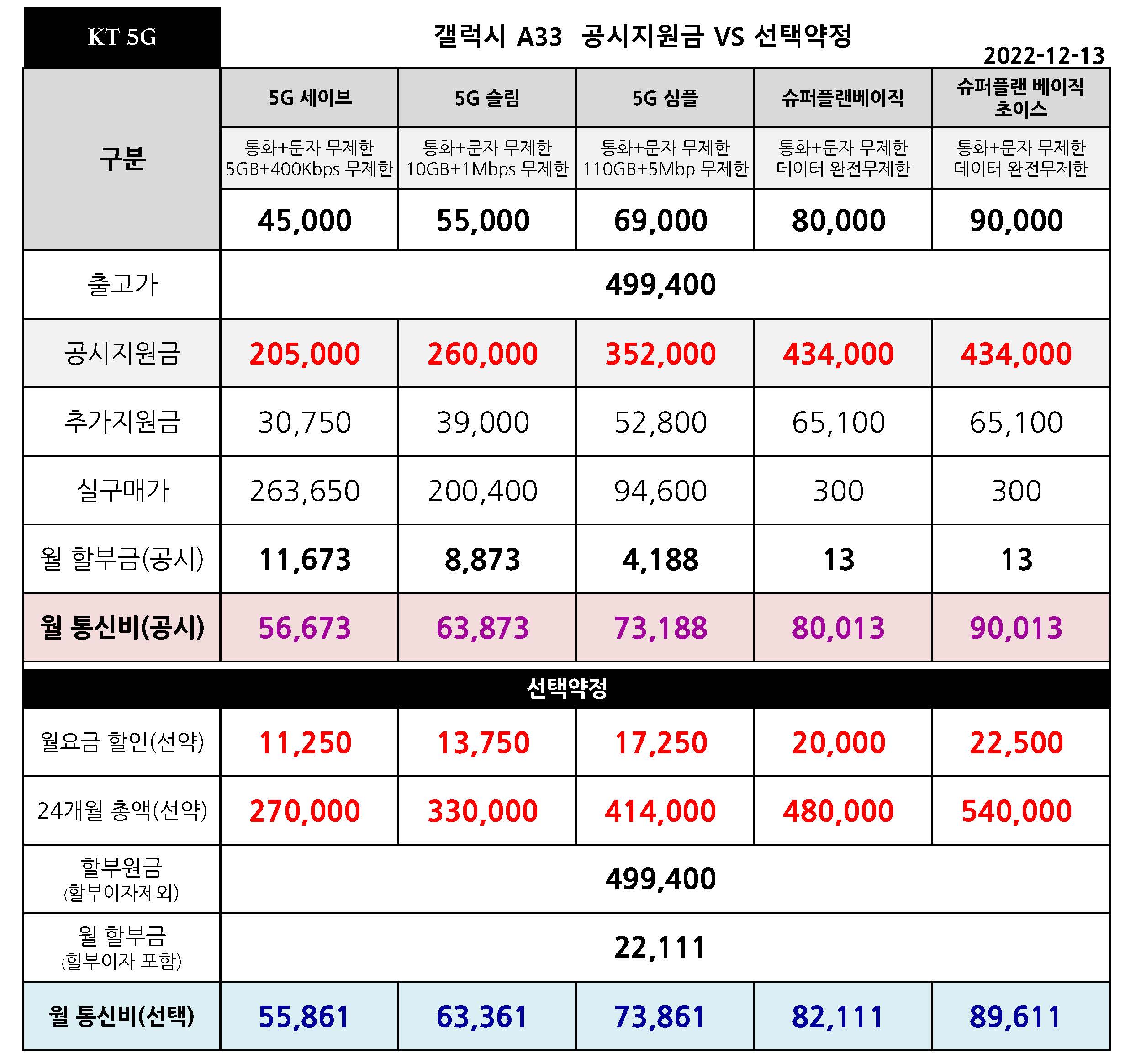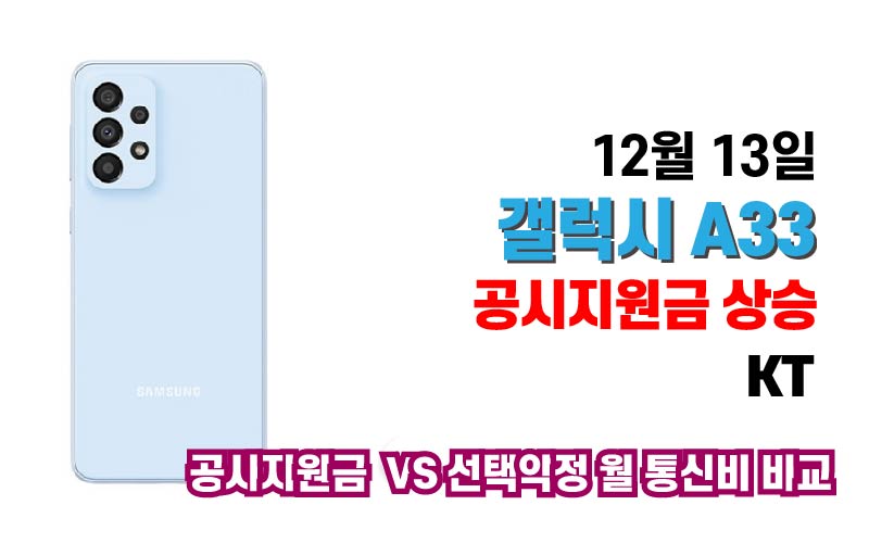 12월 13일 KT에서 갤럭시 A33 공시지원금이 상승하였습니다.