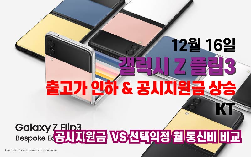 22년 12월 16일KT에서 갤럭시 Z 플립3 의 출고가와 공시지원금을 상향 조정하였습니다.