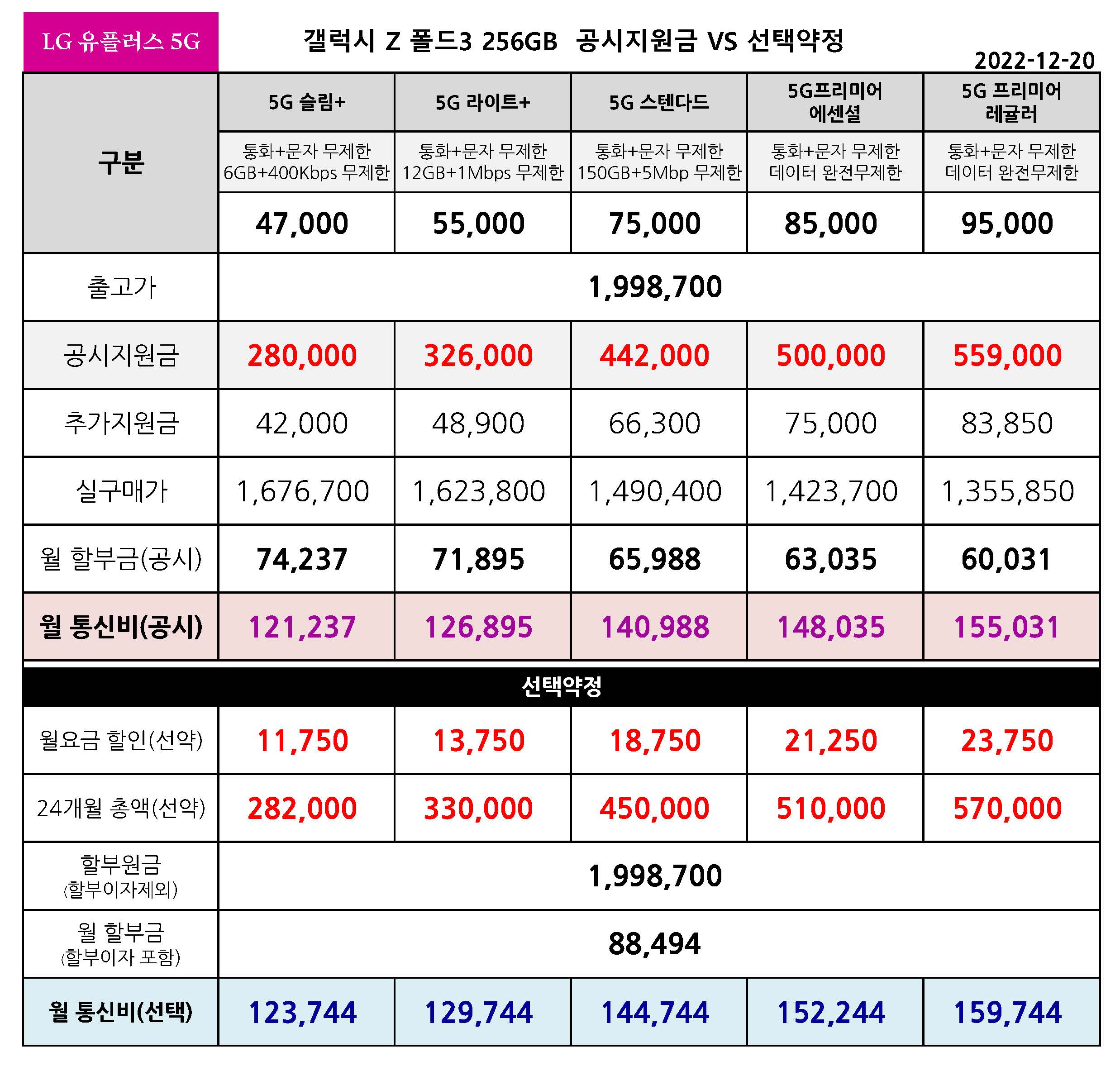 - LG 유플러스 갤럭시 Z 폴드 256기가 / 512기가 공시지원금 VS 선택약정 월 통신비