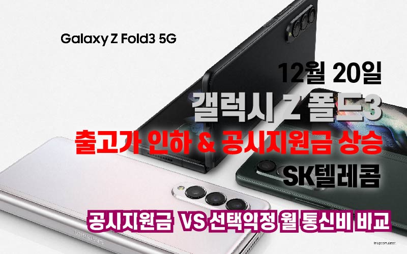 12월 20일 SK텔레콤 에서도 Z 플립3 와 폴드3 의 출고가 인하와 공시지원금을 상향조정 하였습니다.