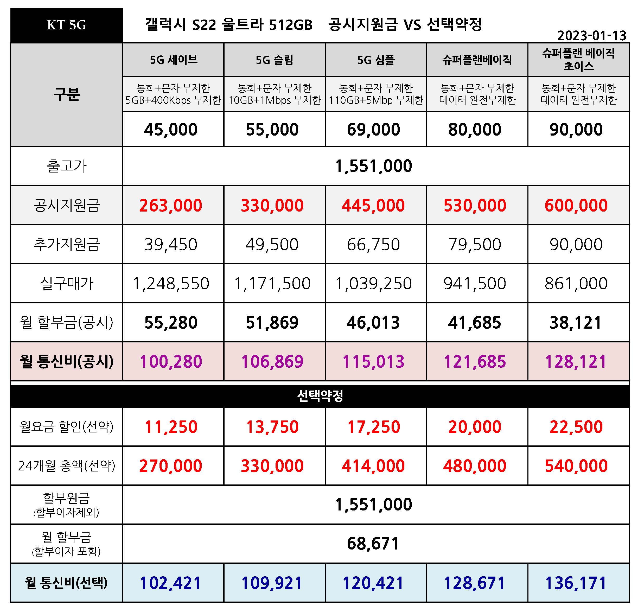 - KT 갤럭시 S22 울트라 공시지원금 VS 선택약정 월 통신비 비교