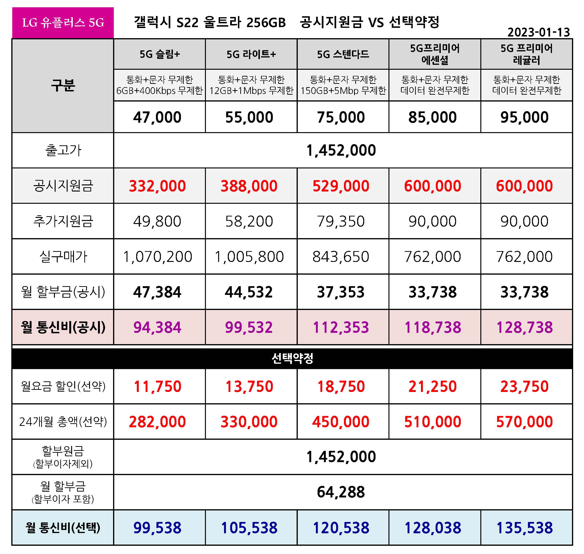 - LG 유플러스 갤럭시 S22 울트라 공시지원금 VS 선택약정 월 통신비 비교