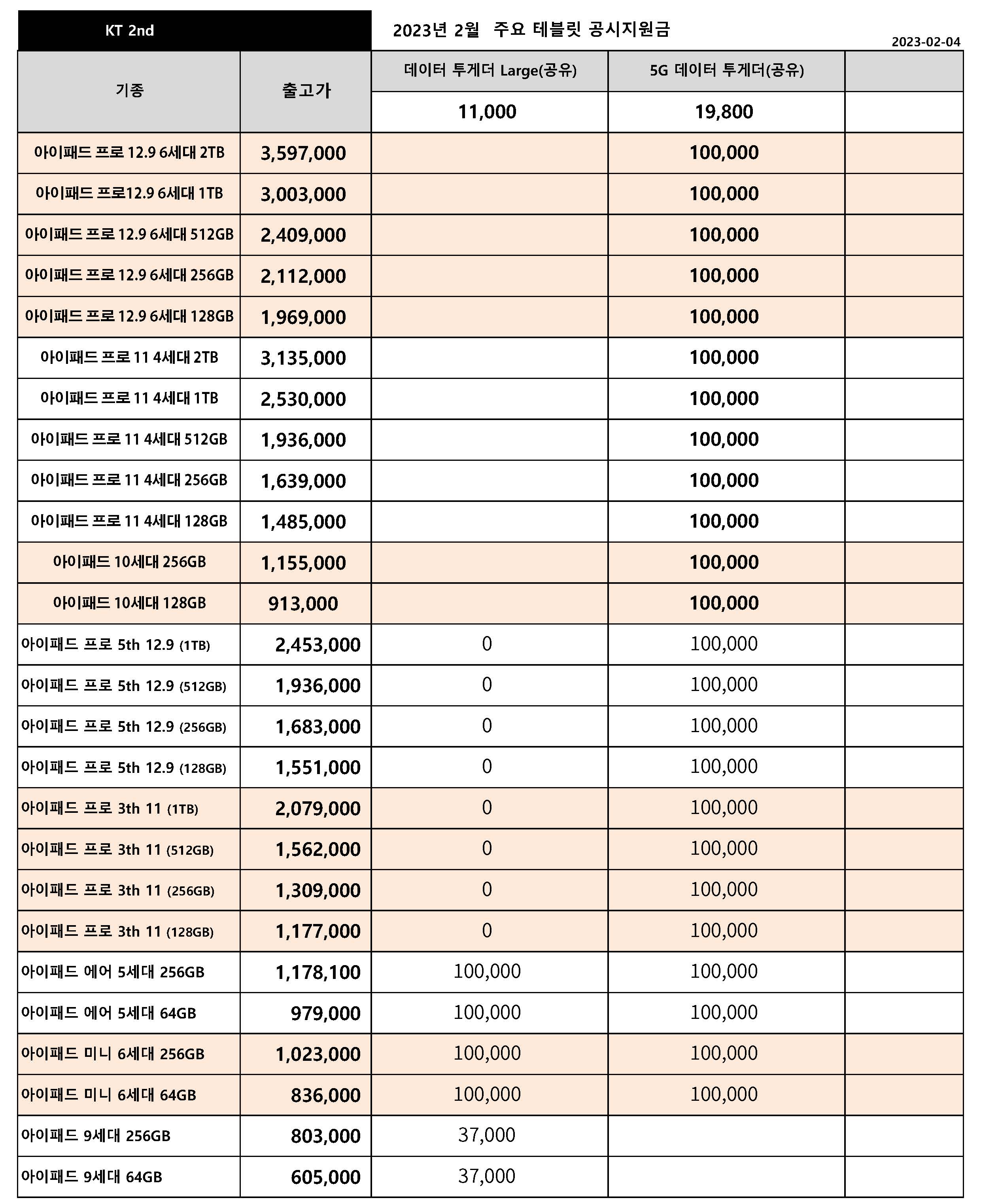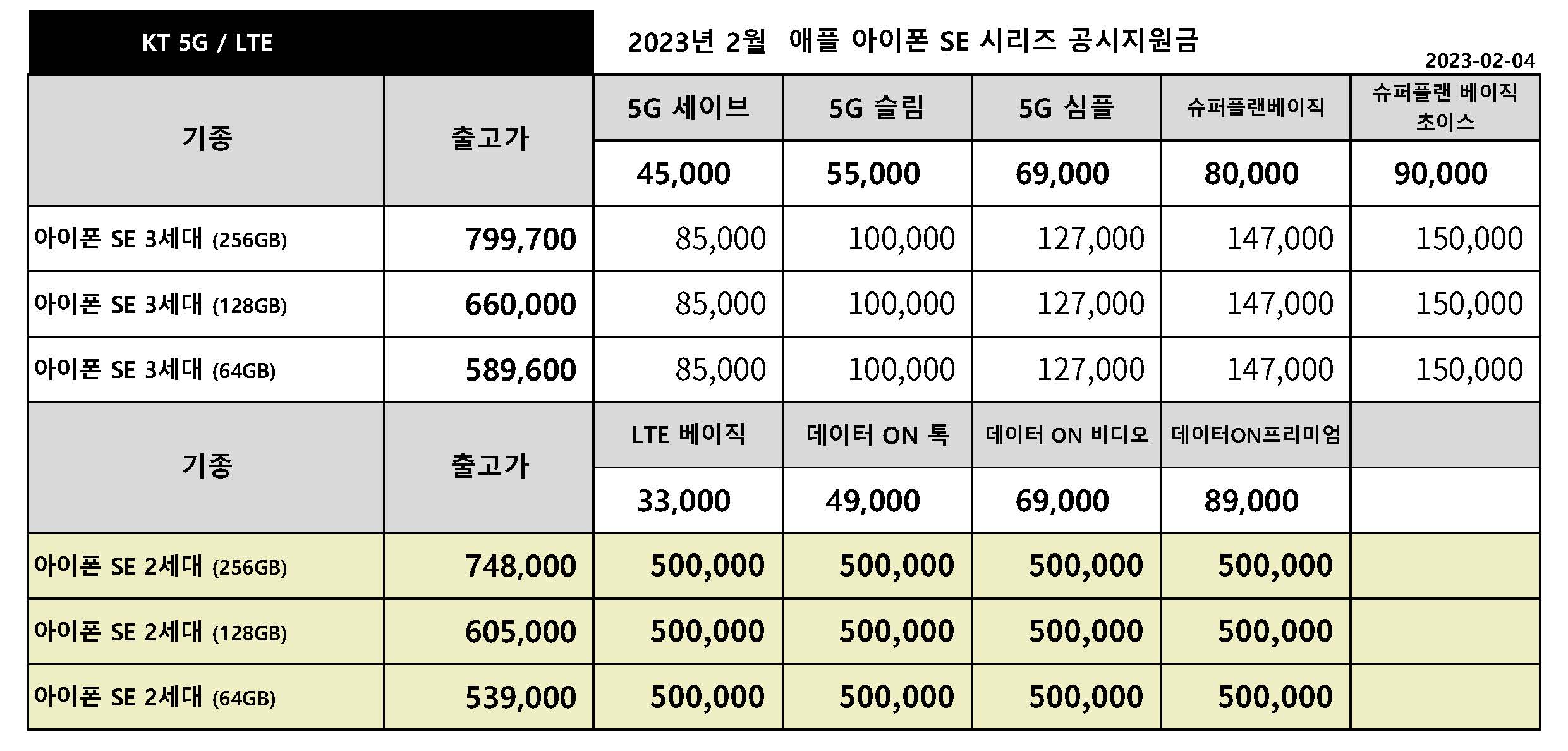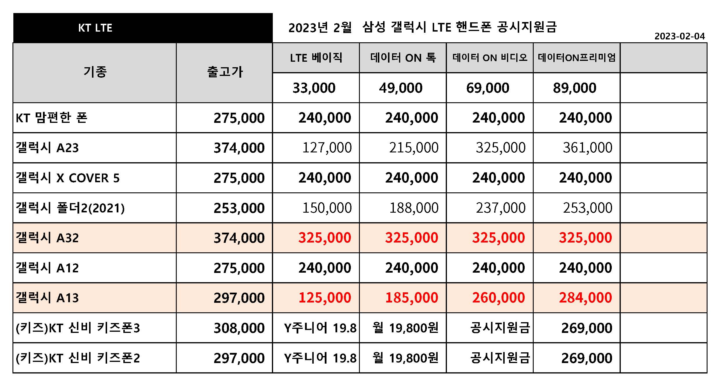 23년 2월 KT 주요 핸드폰 공시지원금 정리 - 2월 4일 기준
