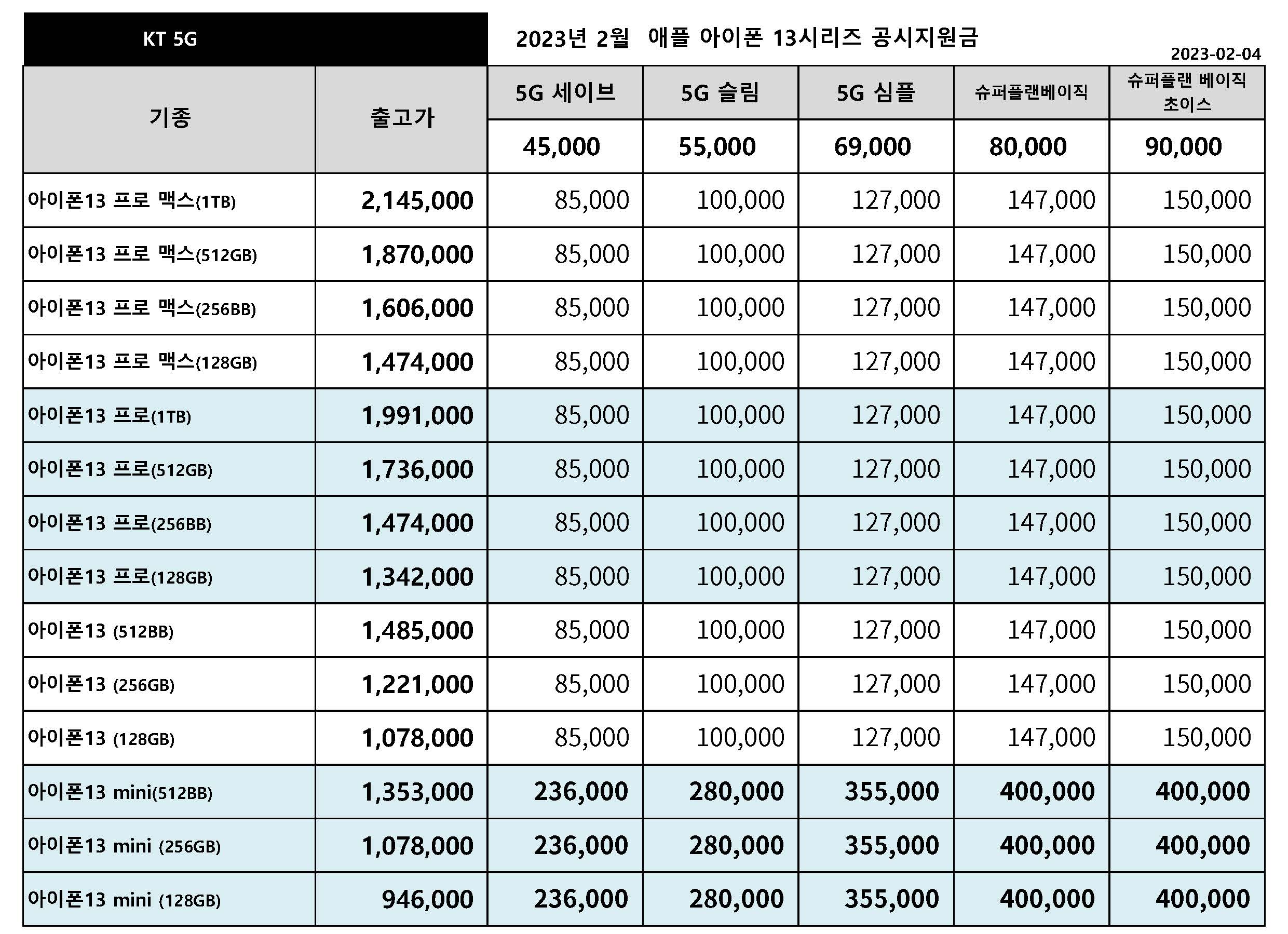 23년 2월 KT 주요 핸드폰 공시지원금 정리 입니다