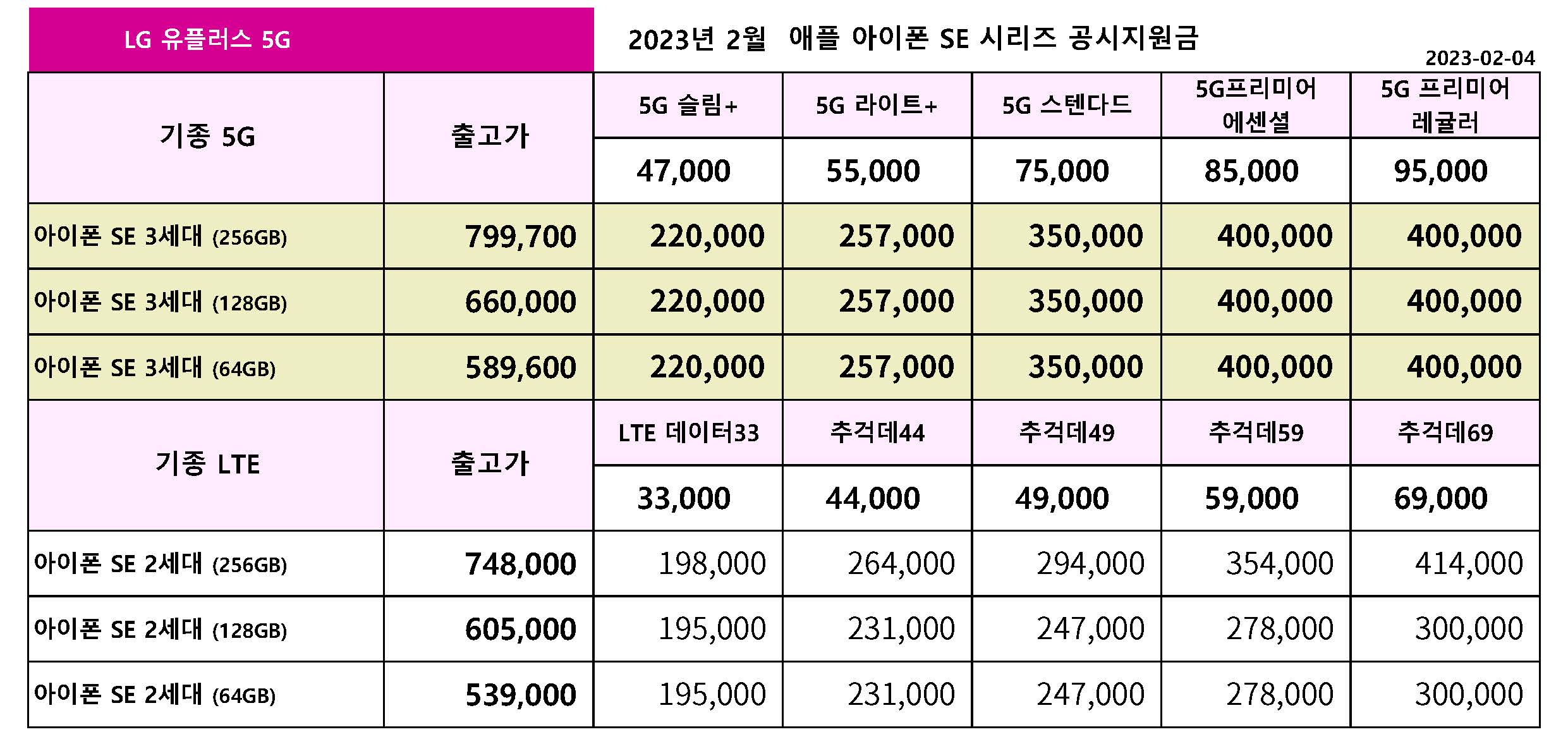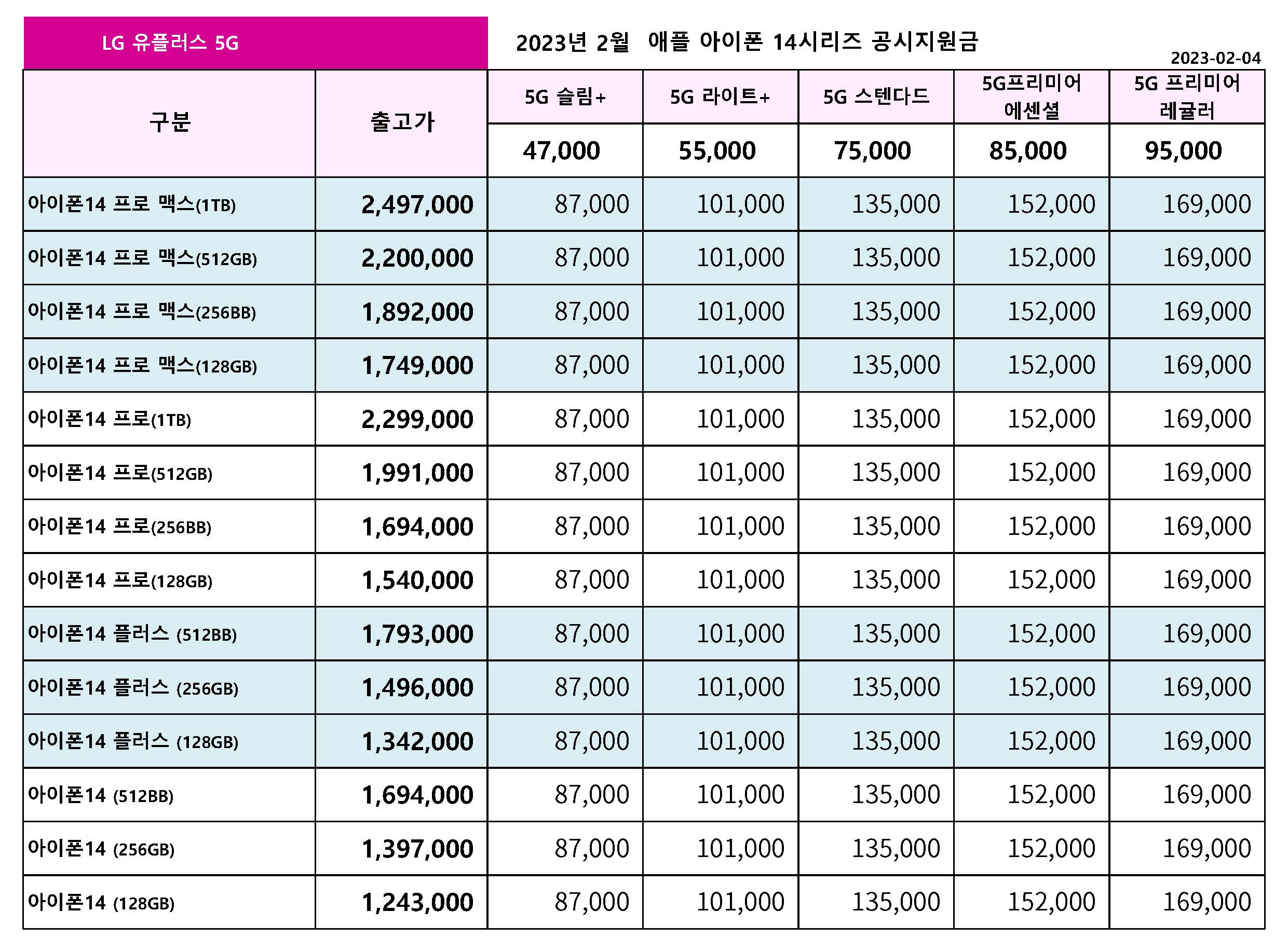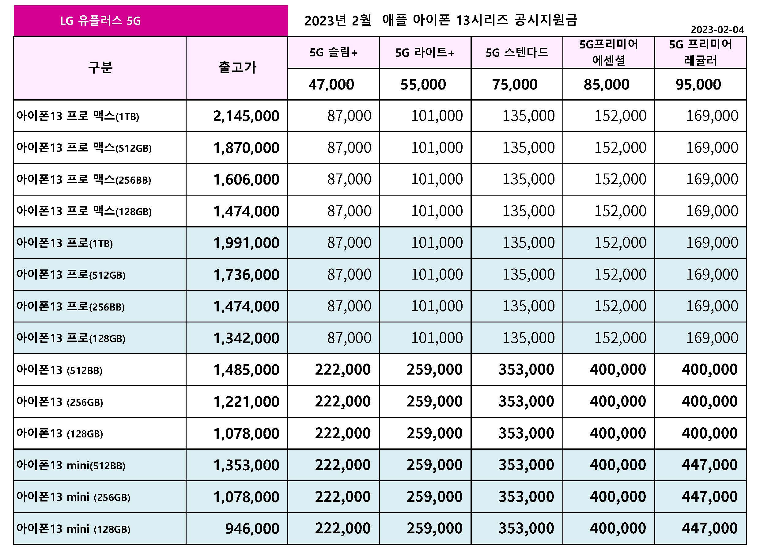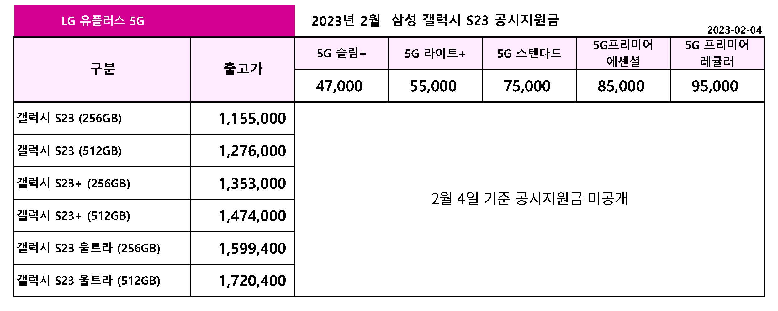 23년 2월 LG 유플러스 주요 핸드폰 공시지원금 - 2월 4일 기준