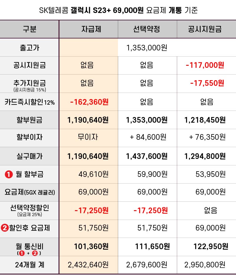 SK텔레콤 갤럭시 S23 플러스 69,000원(5GX 레귤러)요금제기준