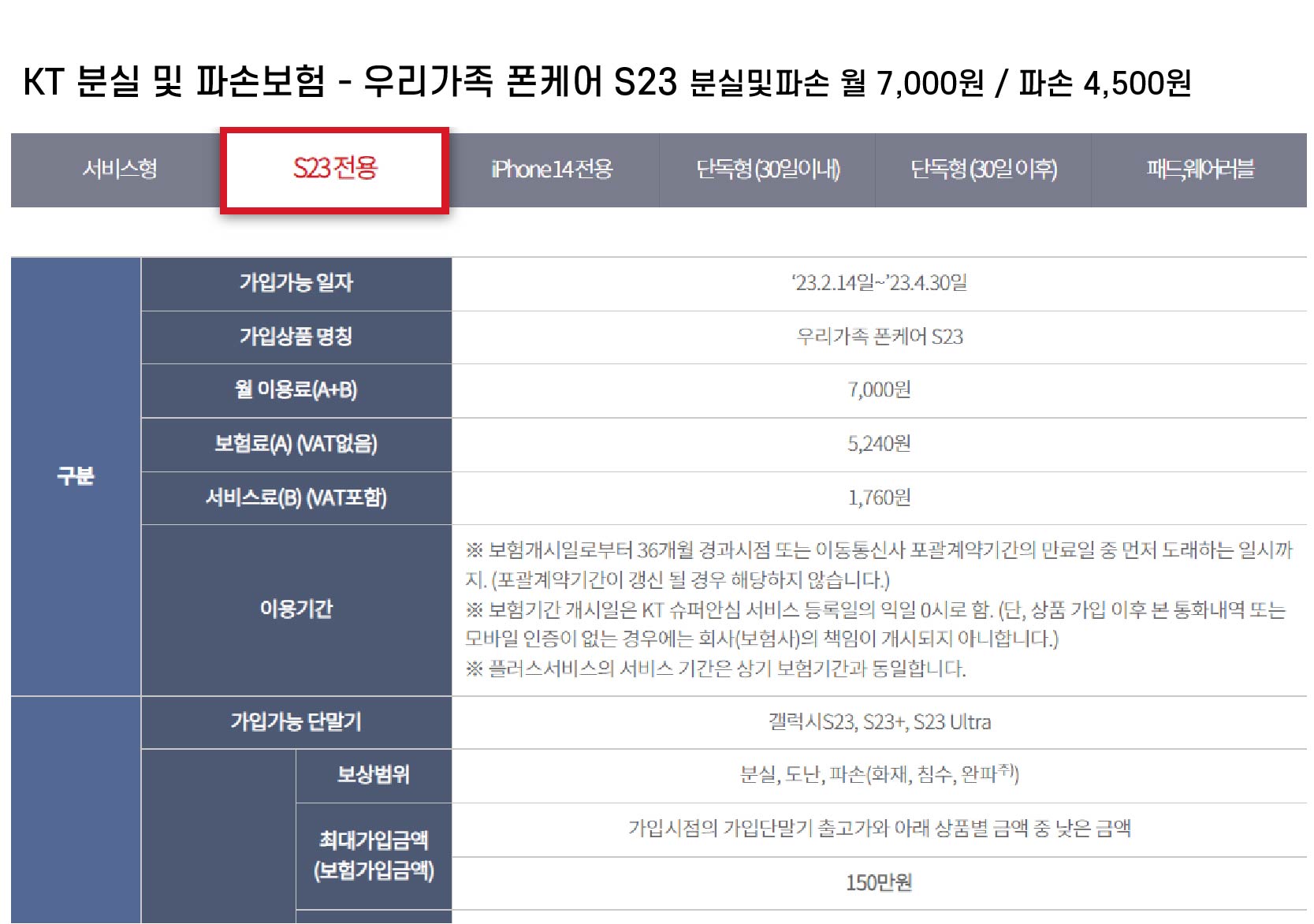 ** KT 분실 및 파손보험 - 우리가족 폰케어 S23