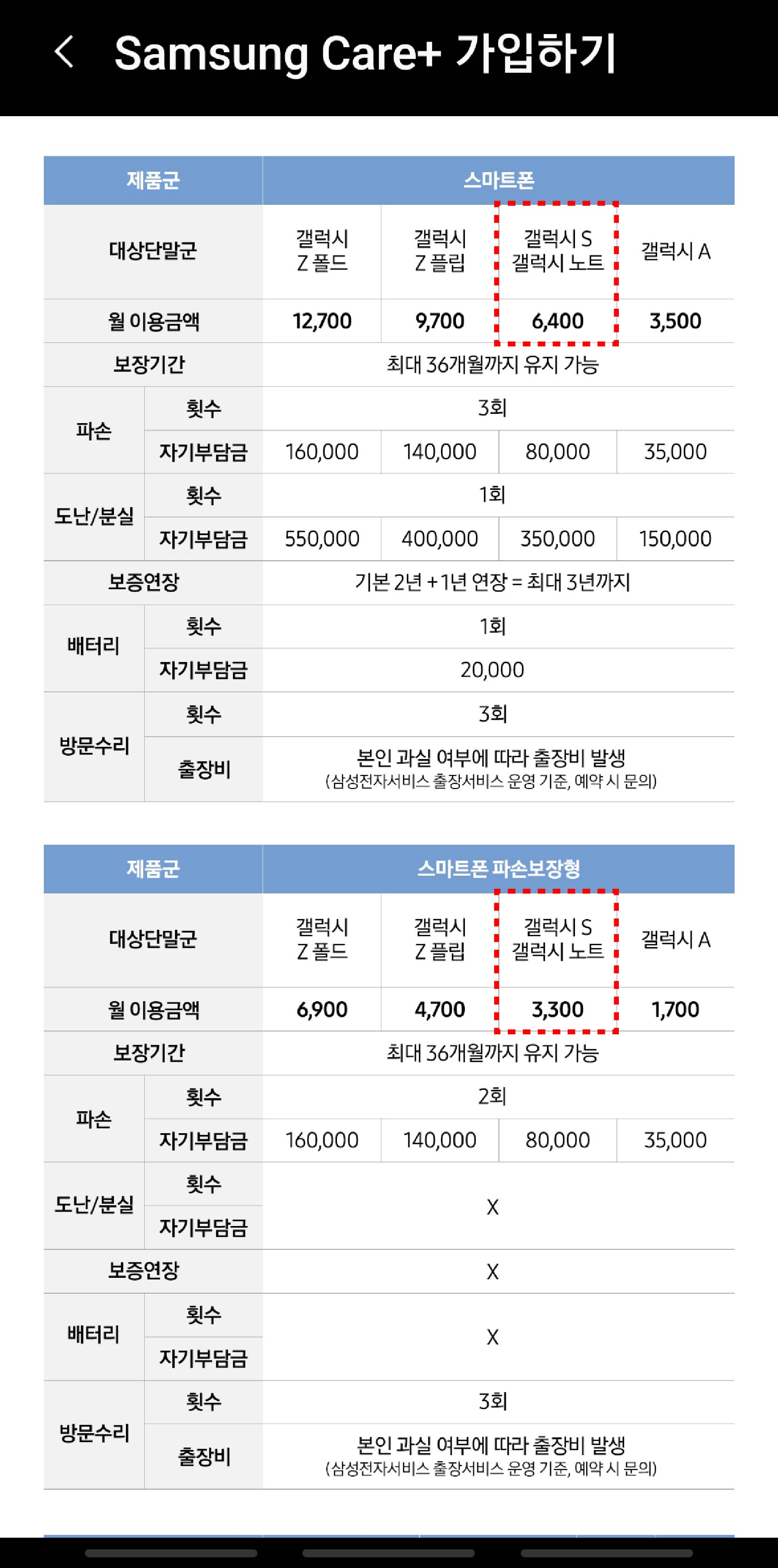 - 갤럭시 S23 분실 및 파손보험 월 8,000원 / 파손 월 5,200원