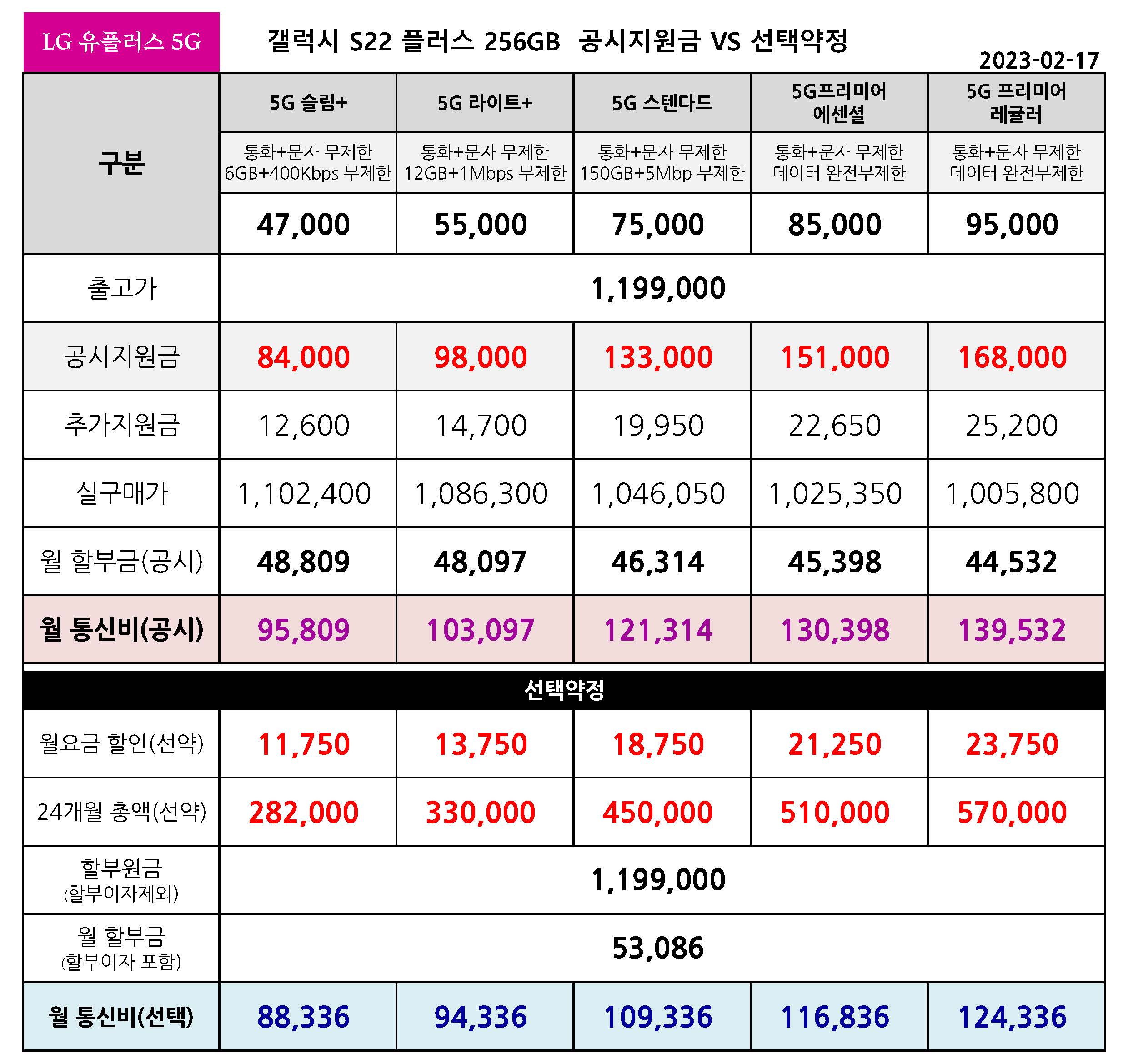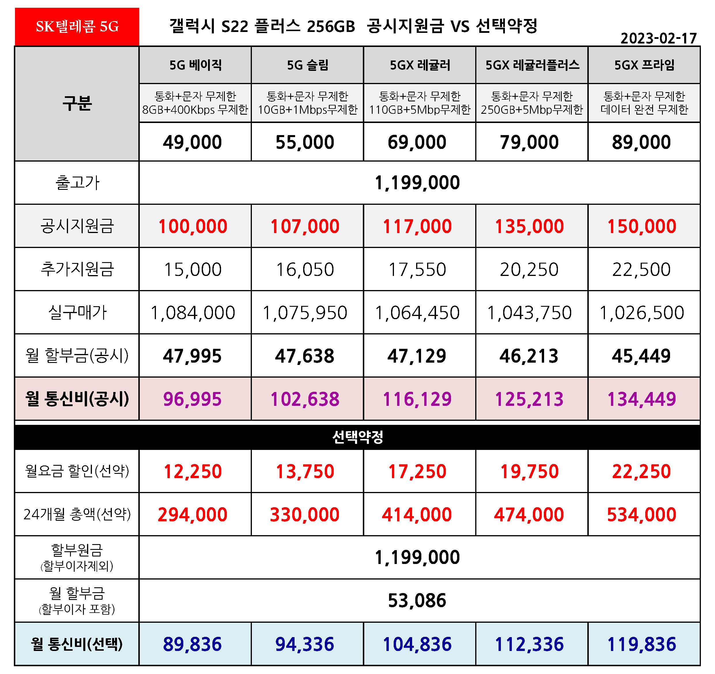 갤럭시 S22 플러스 VS 갤럭시 S23 플러스 256기가 공시지원금 & 선택약정 월 통신비 비교