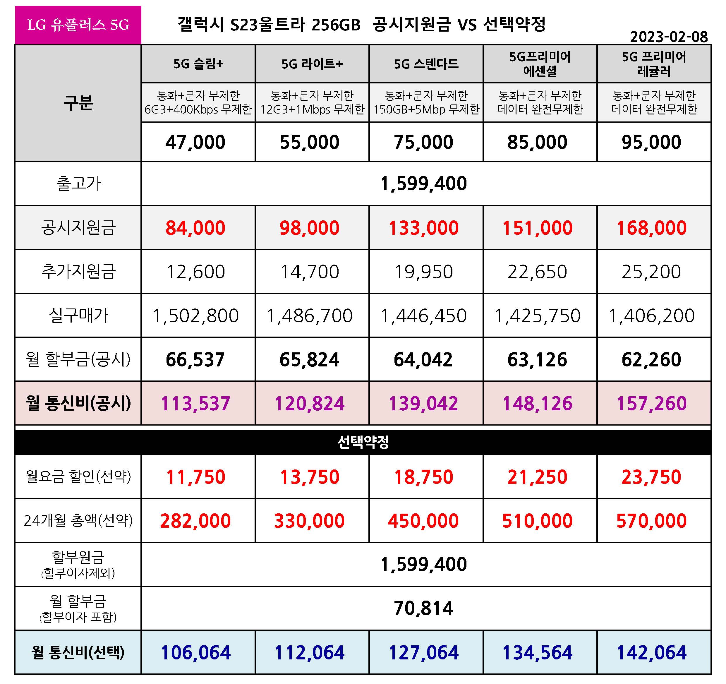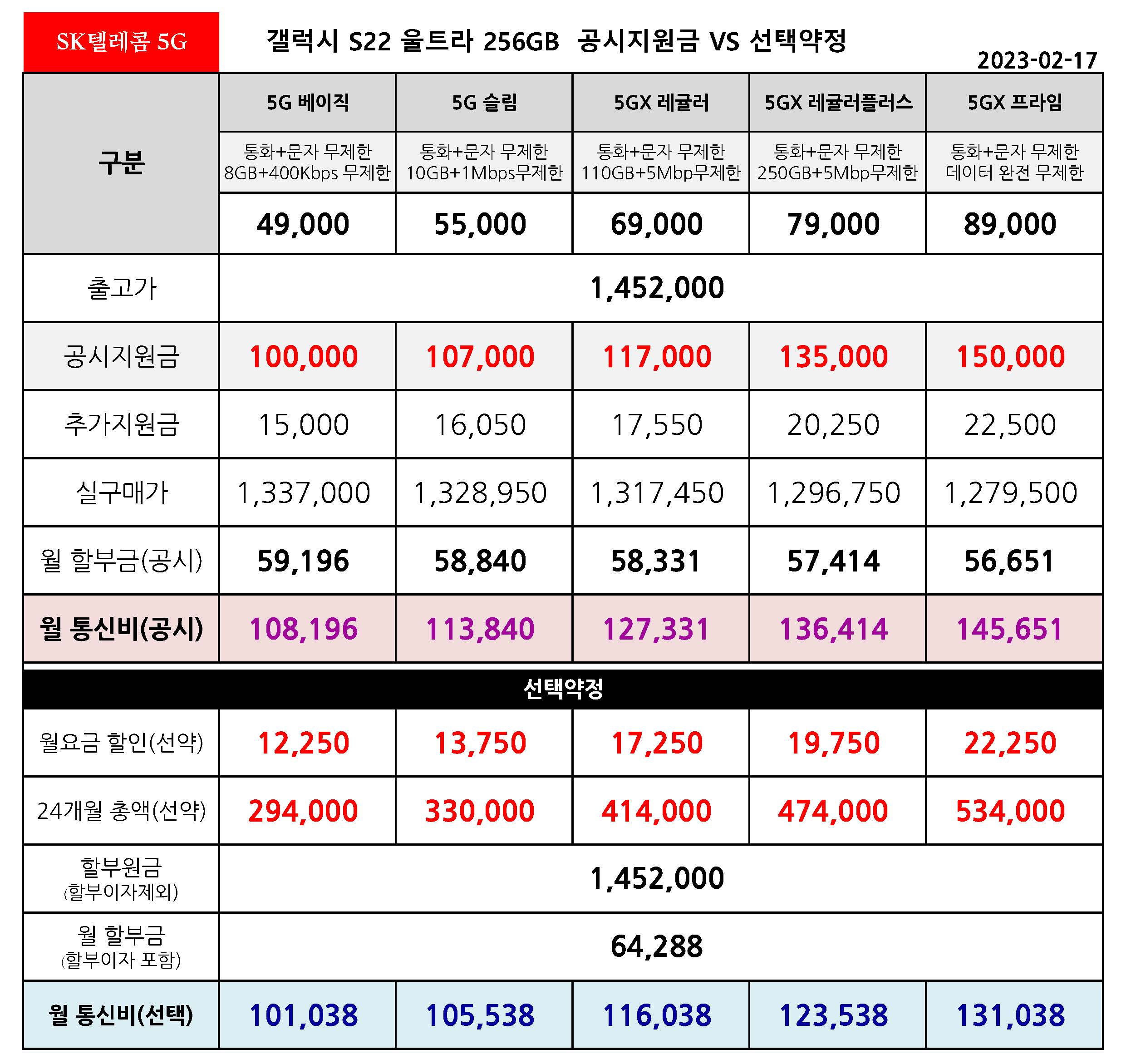 동일한 공시지원금을 지원하고 있어서 S22와 S23의 월 통신비 차이가 크지 않아