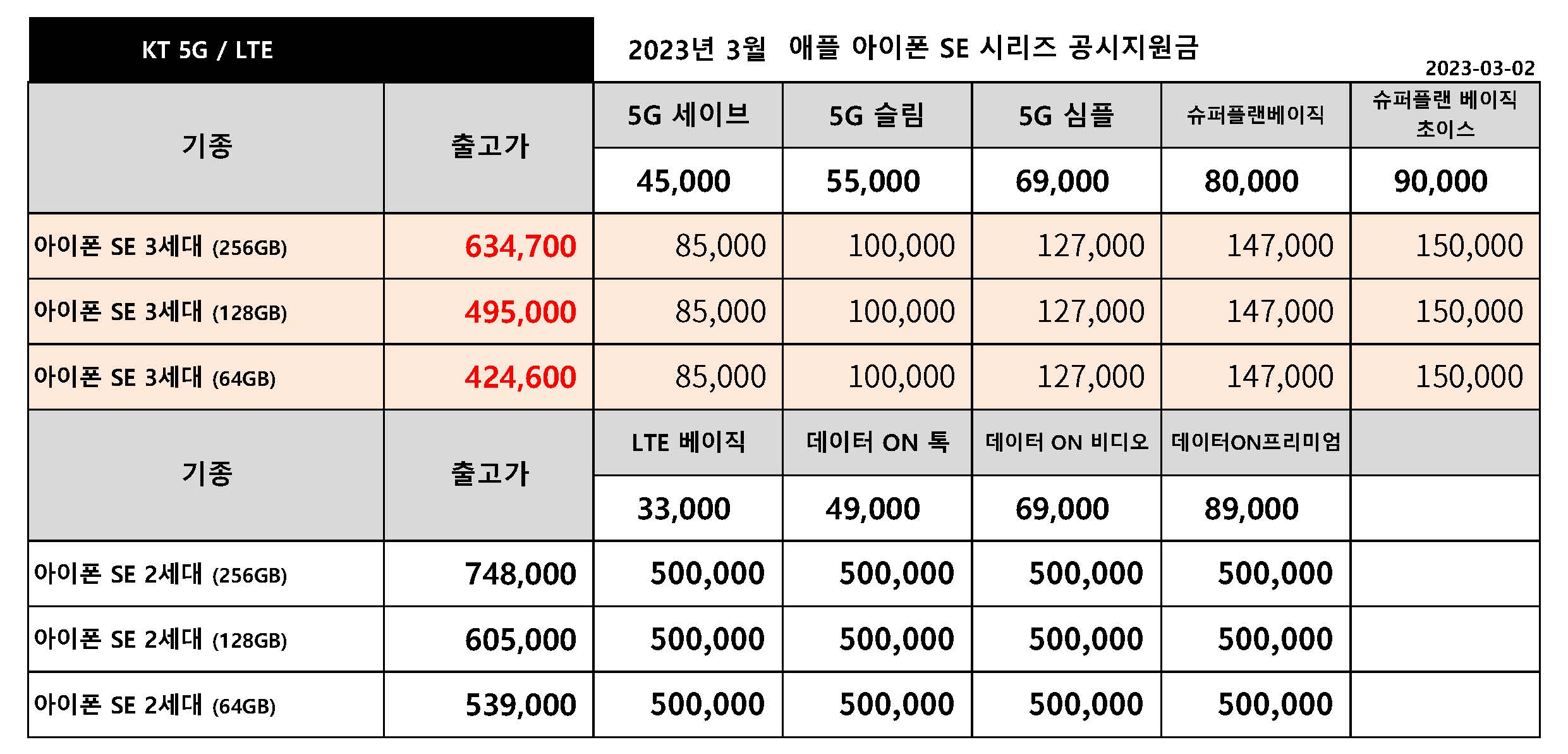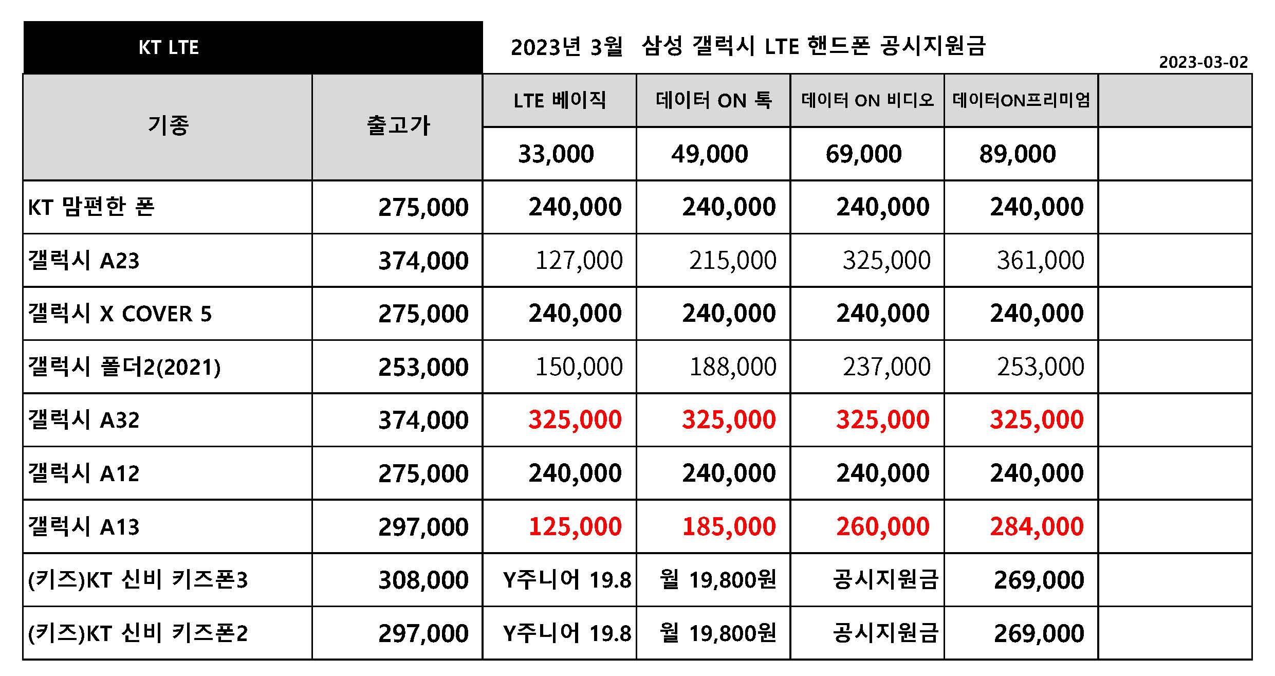 3월 KT 주요 휴대폰 출고가 & 공시지원금 - 23년 3월 2일기준