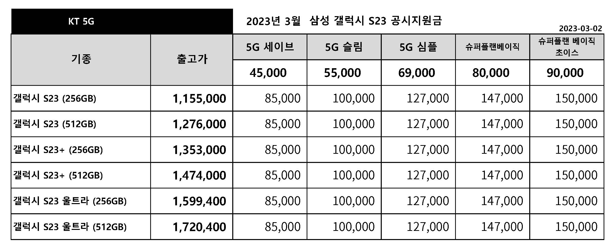 3월 KT 주요 휴대폰 출고가 & 공시지원금 - 23년 3월 2일기준