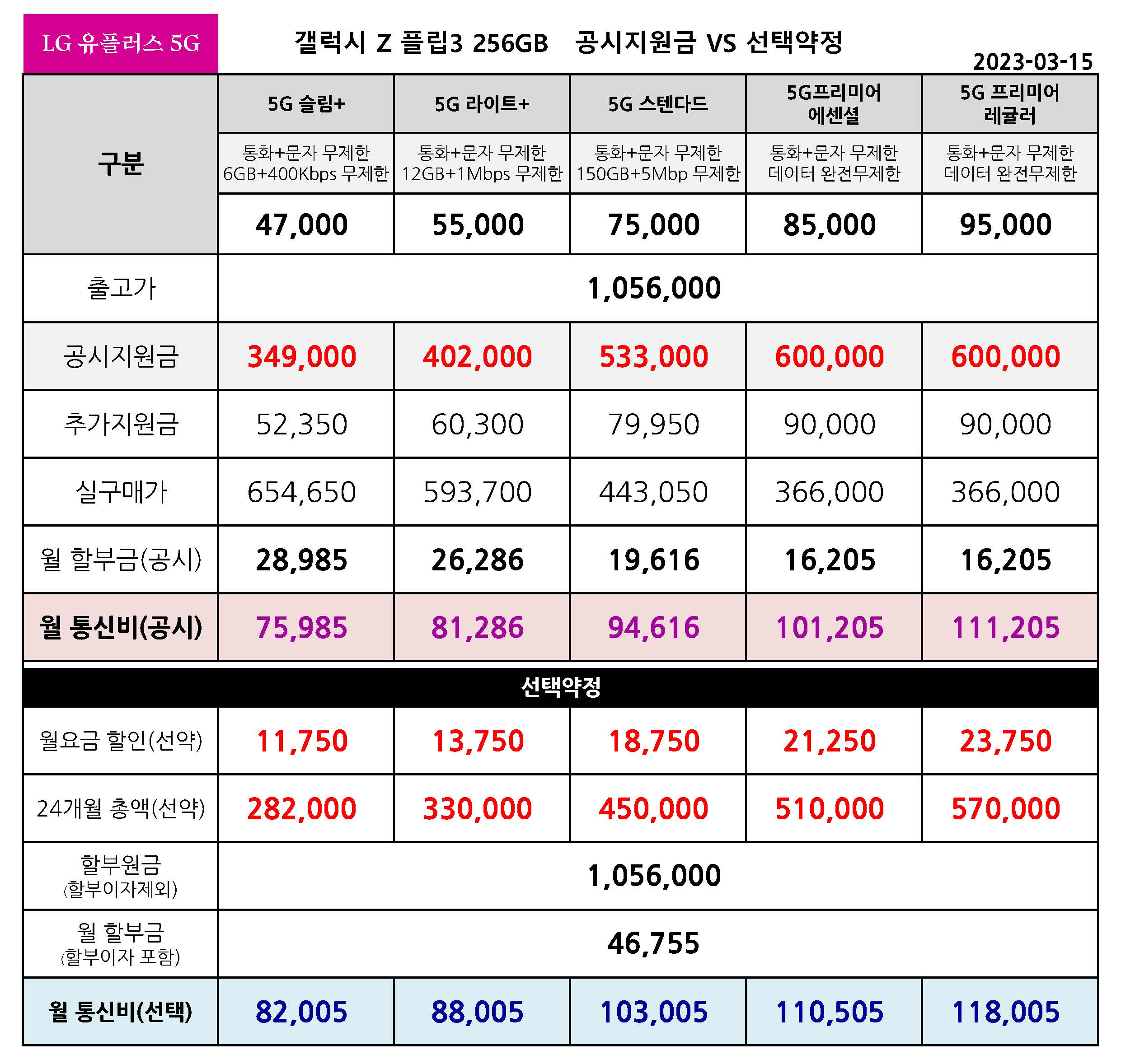 | 갤럭시 Z 플립5 공시지원금 & 선택약정 월 통신비 비교 - 자급제폰 VS 통신사 개통? (0) | 2023.08.01 |