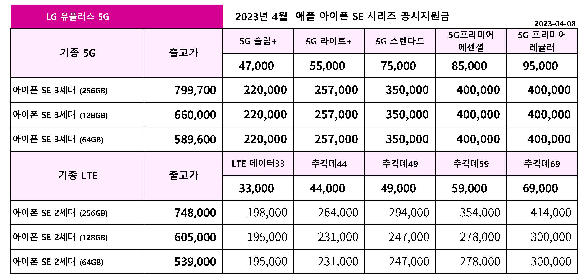 23년 4월 LG 유플러스 주요 핸드폰 공시지원금 정리 입니다