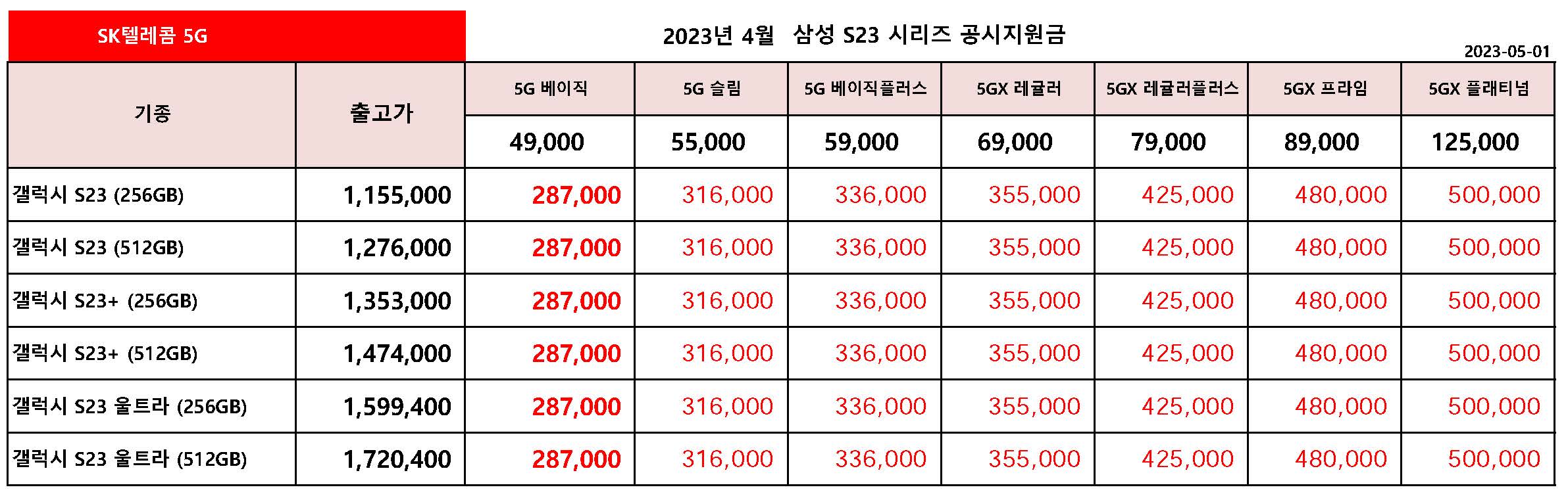 5월 SK텔레콤 갤럭시 S23 시리즈 공시지원금