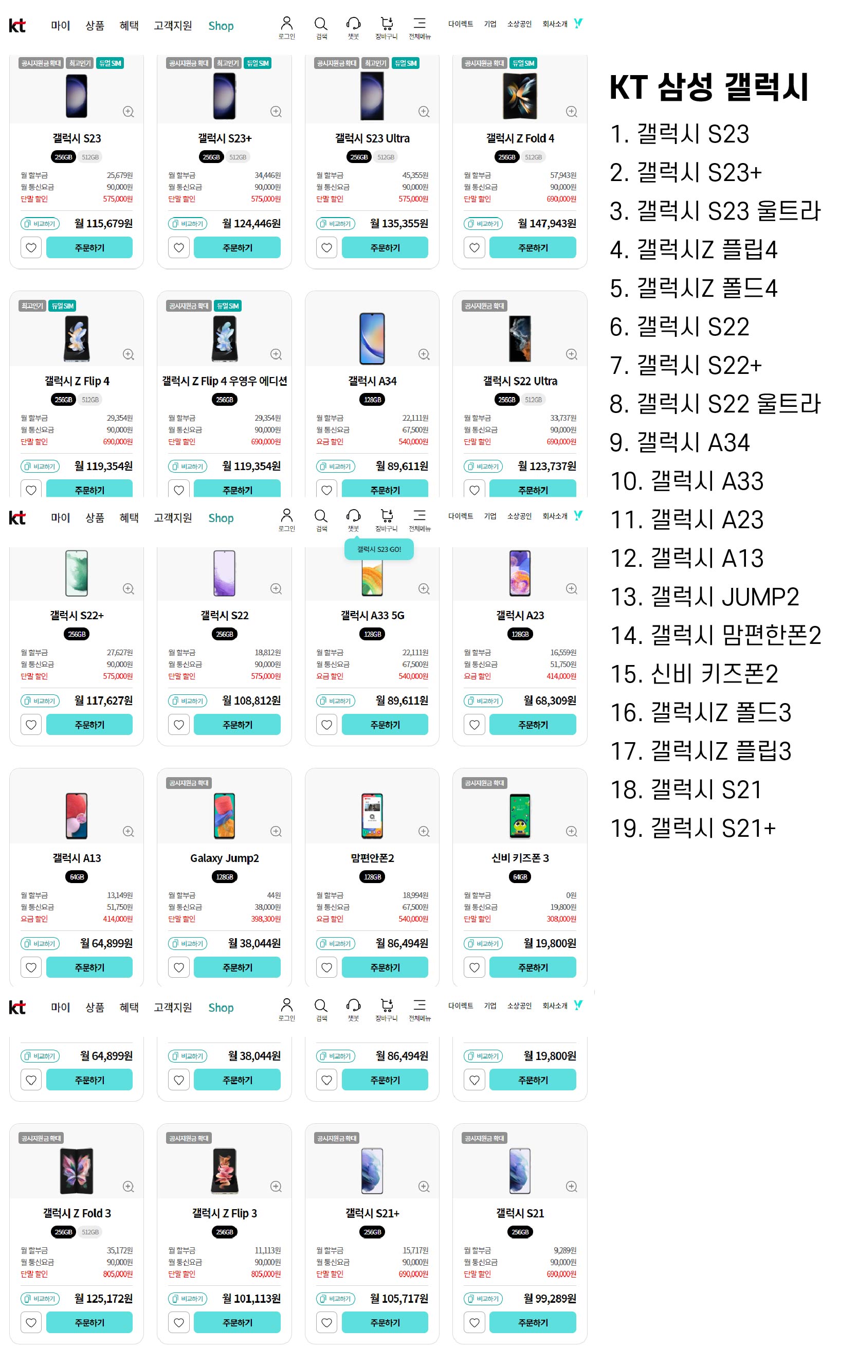 5월 KT 공홈 삼성 갤럭시 계열 판매 휴대폰 - 5G, LTE, 시니어, 키즈폰 포함 약 19종을 판매중입니다.