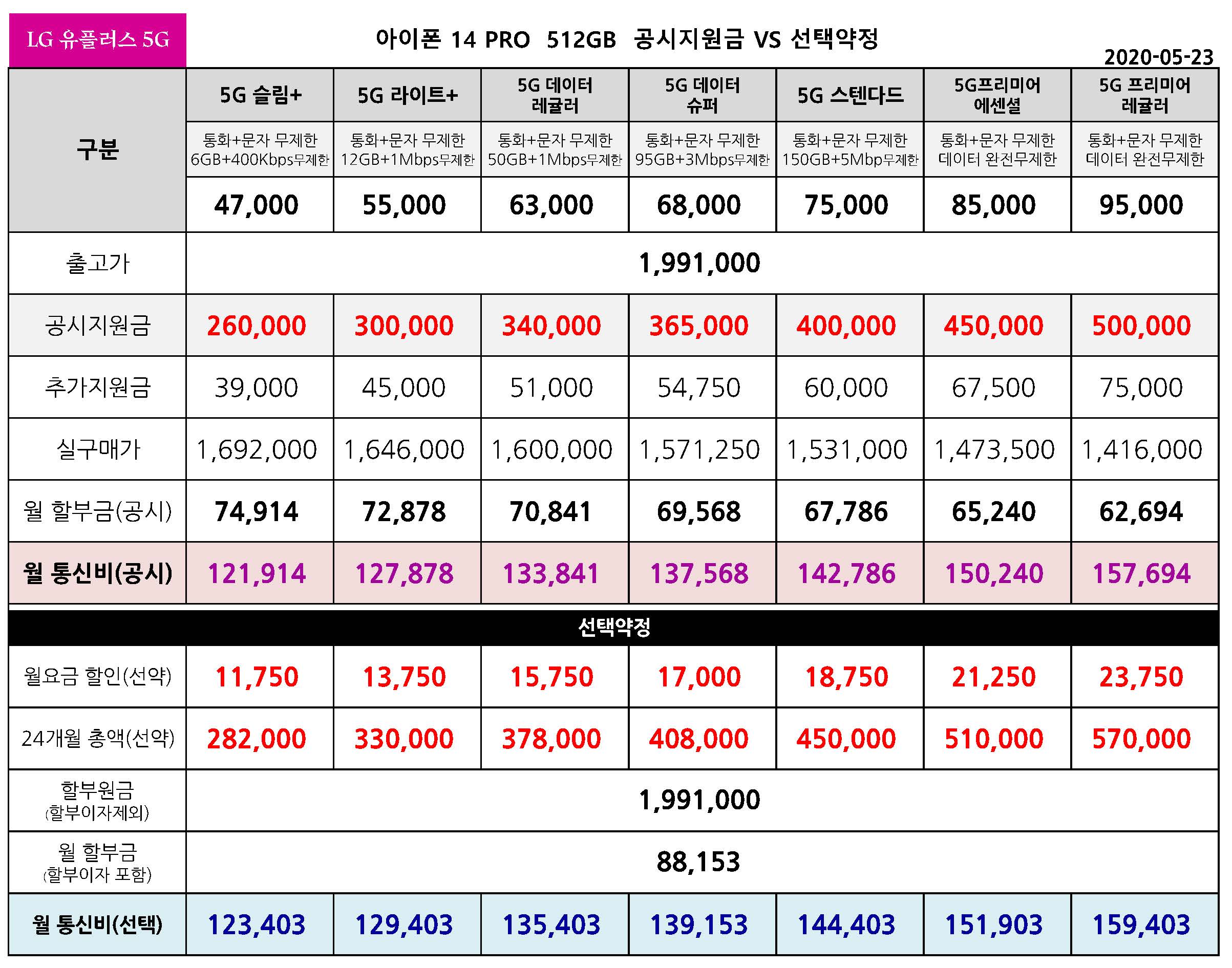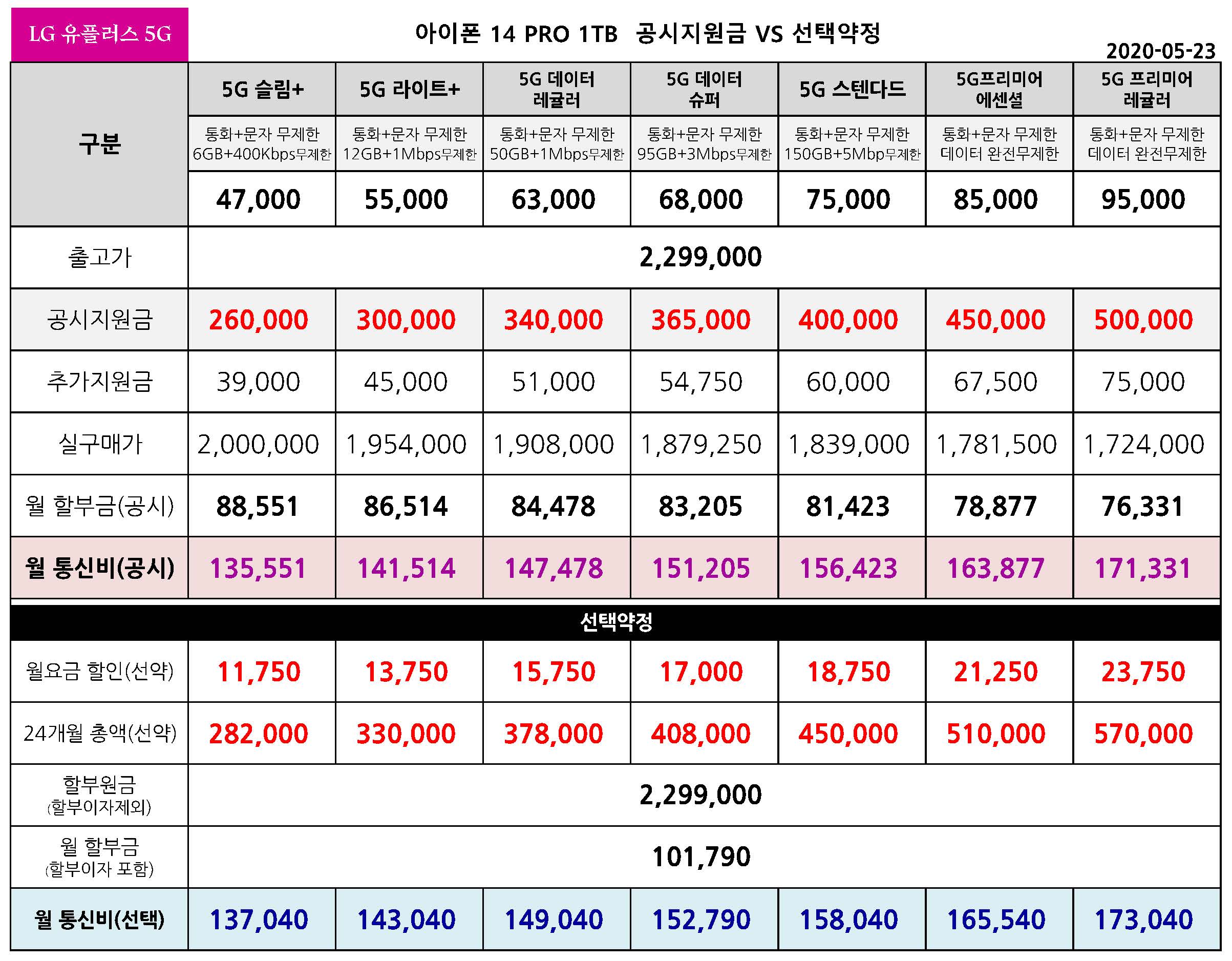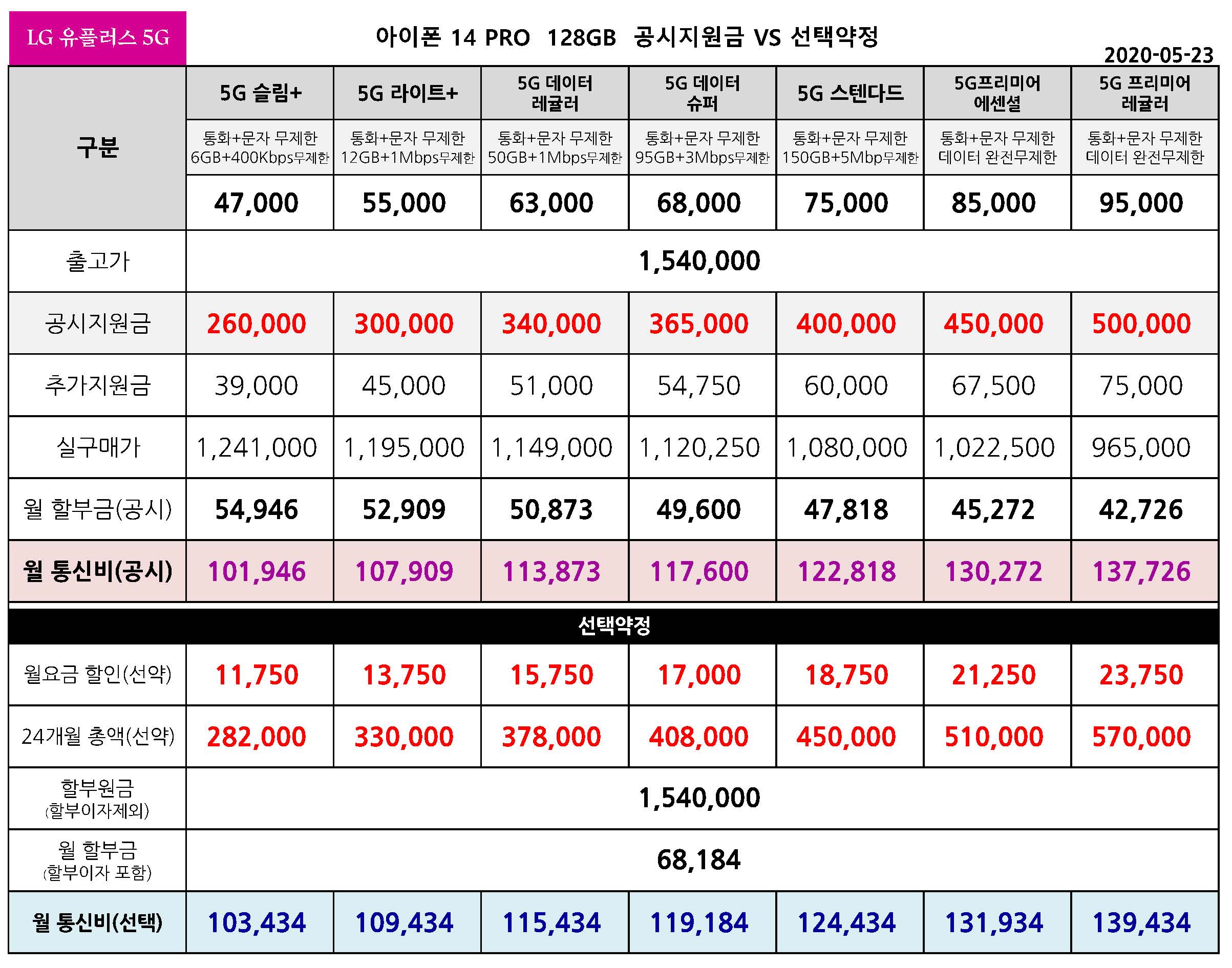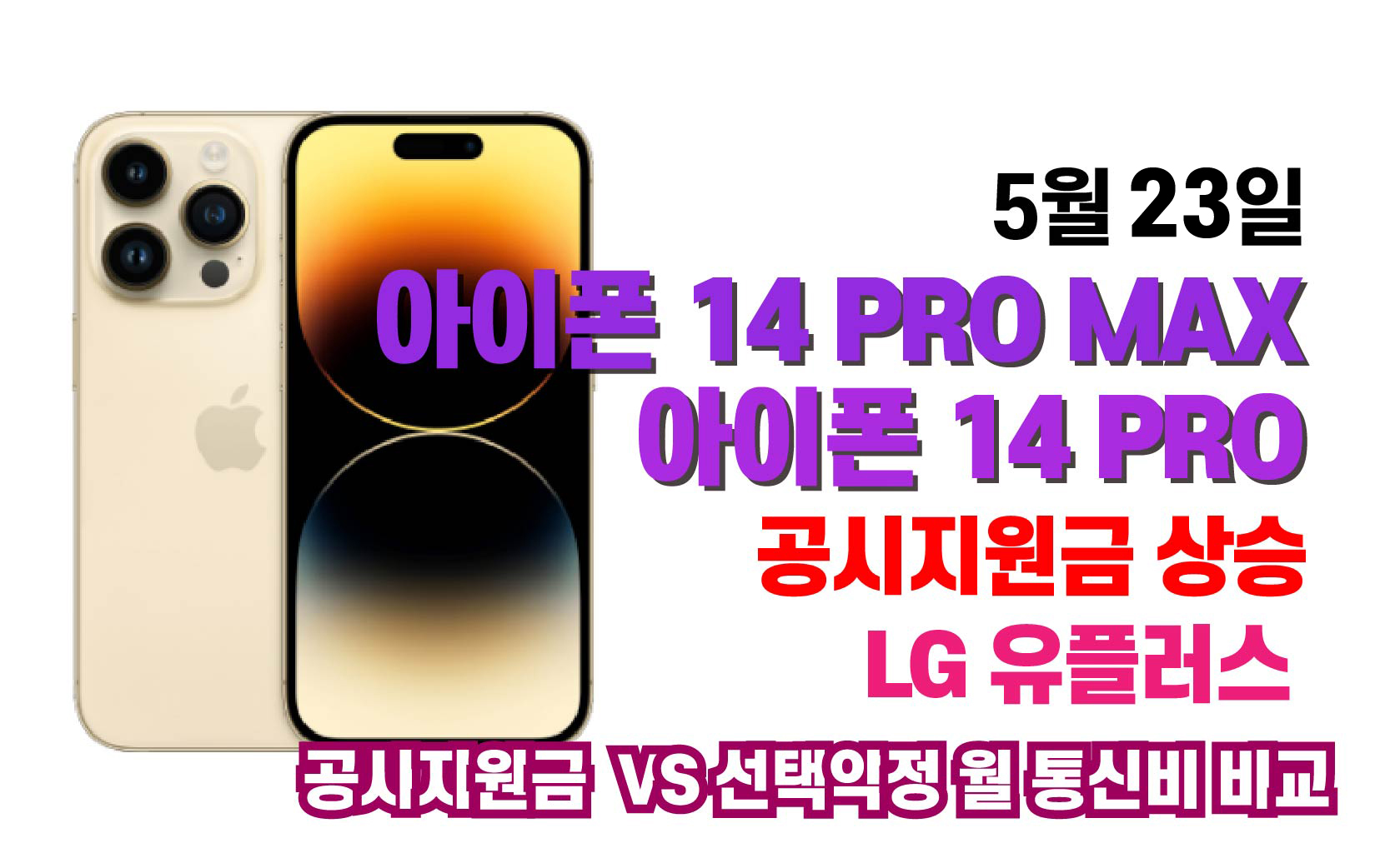 LG 유플러스 아이폰 14 프로, 14 프로 맥스 공시지원금 상향조정 - 공시 VS 선약 요금표 (5월 23일 )