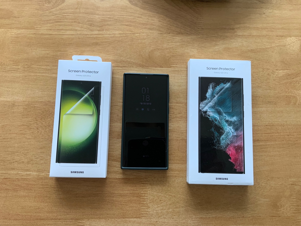 갤럭시 S23 울트라 보호필름과 갤럭시 S22 울트라 보호필름을 겹쳐 보았습니다.