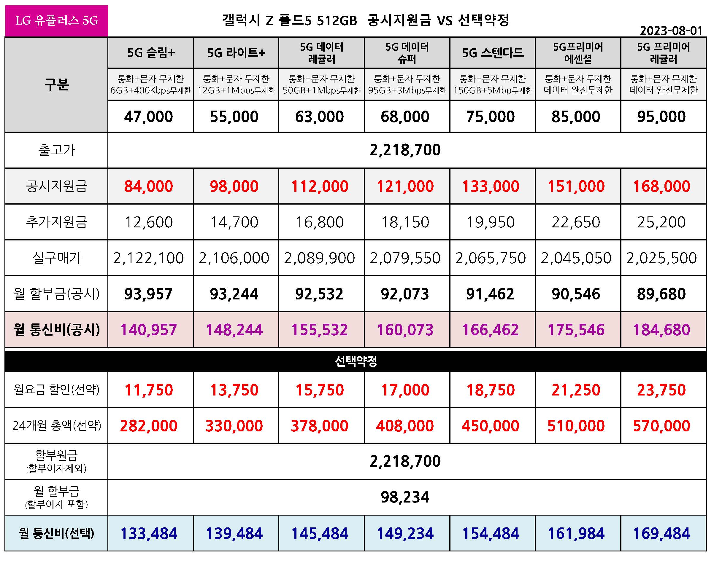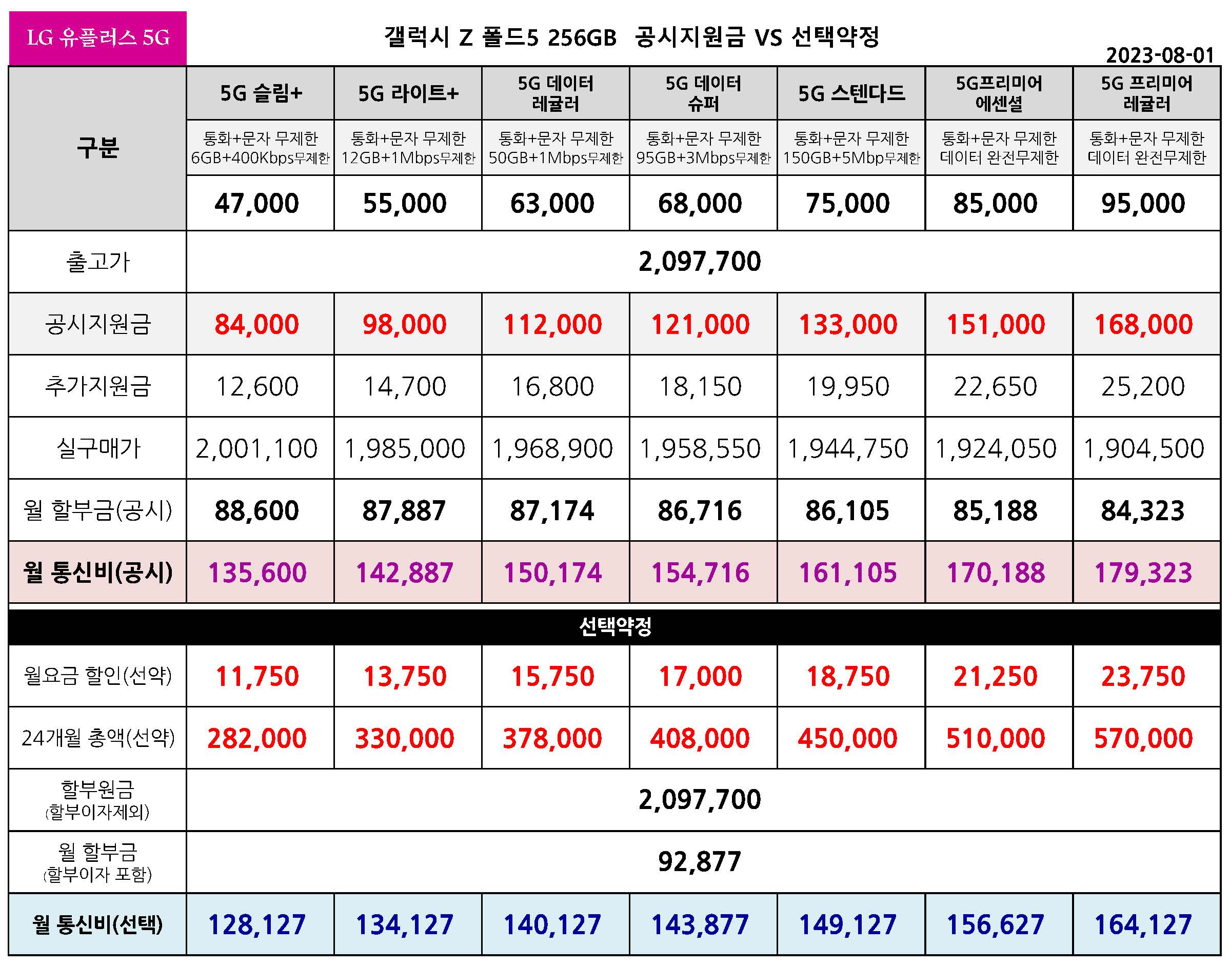 갤럭시 z 폴드5 256기가 공시지원금 vs 선택약정 월 요금표