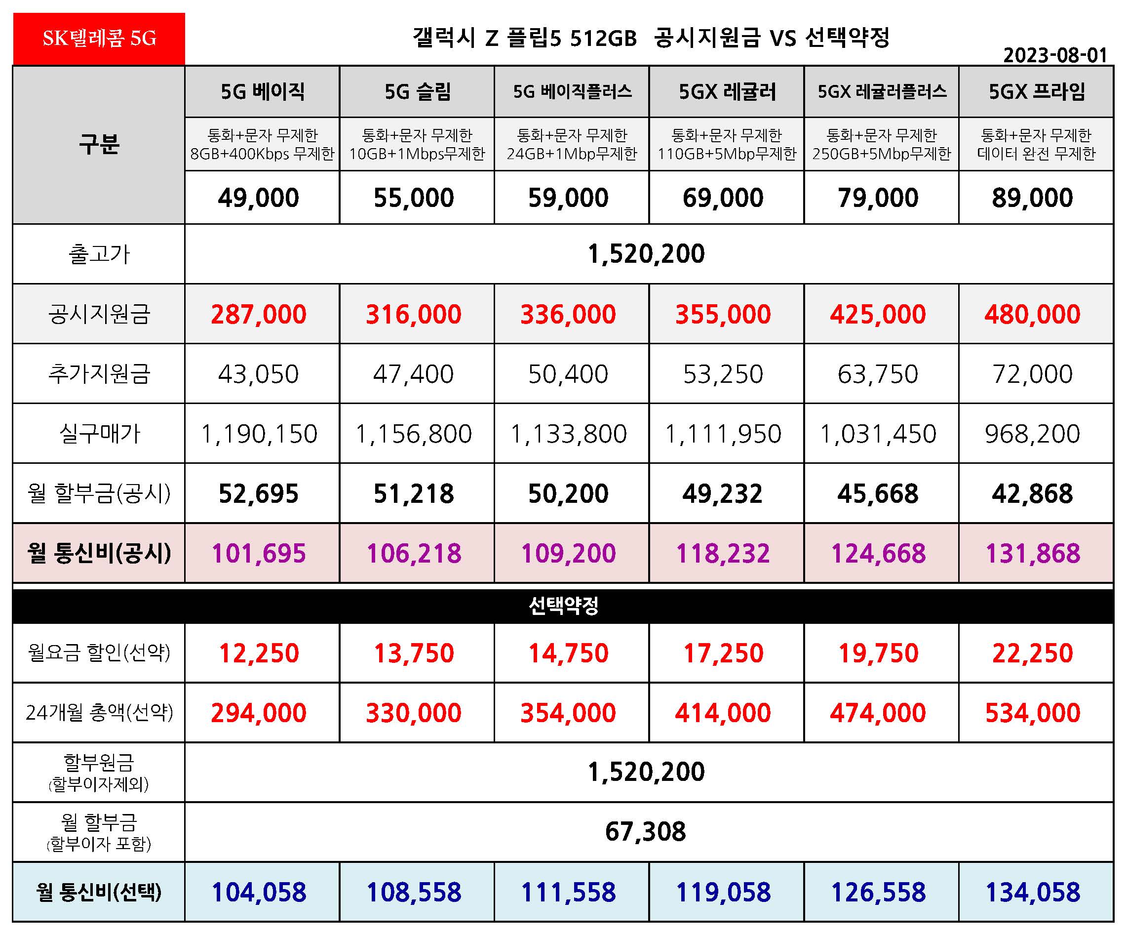 ** 갤럭시 Z 플립5 512기가 월 통신비 비교