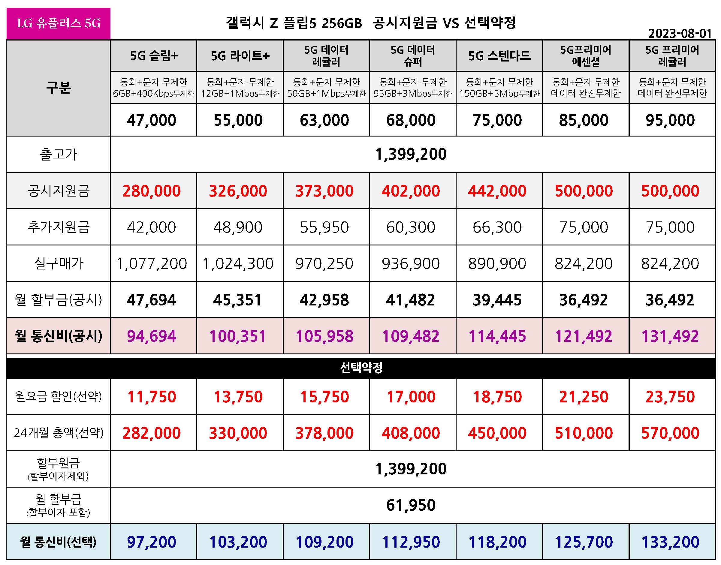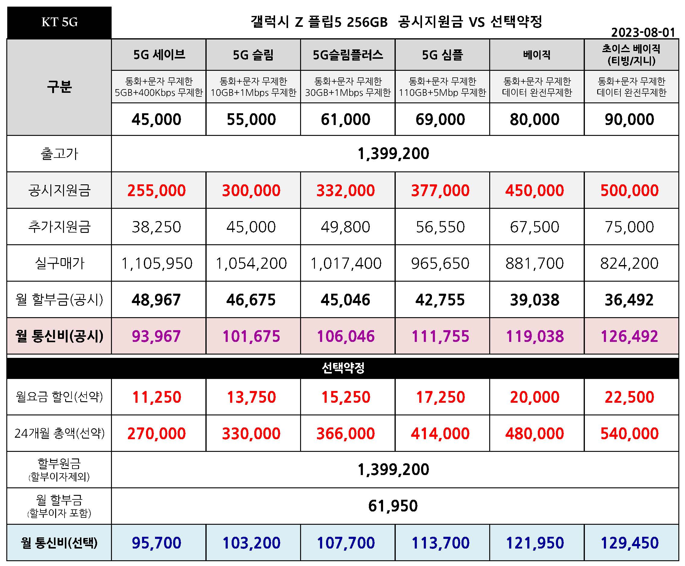 갤럭시 Z 플립5 공시지원금 & 선택약정 월 통신비 비교