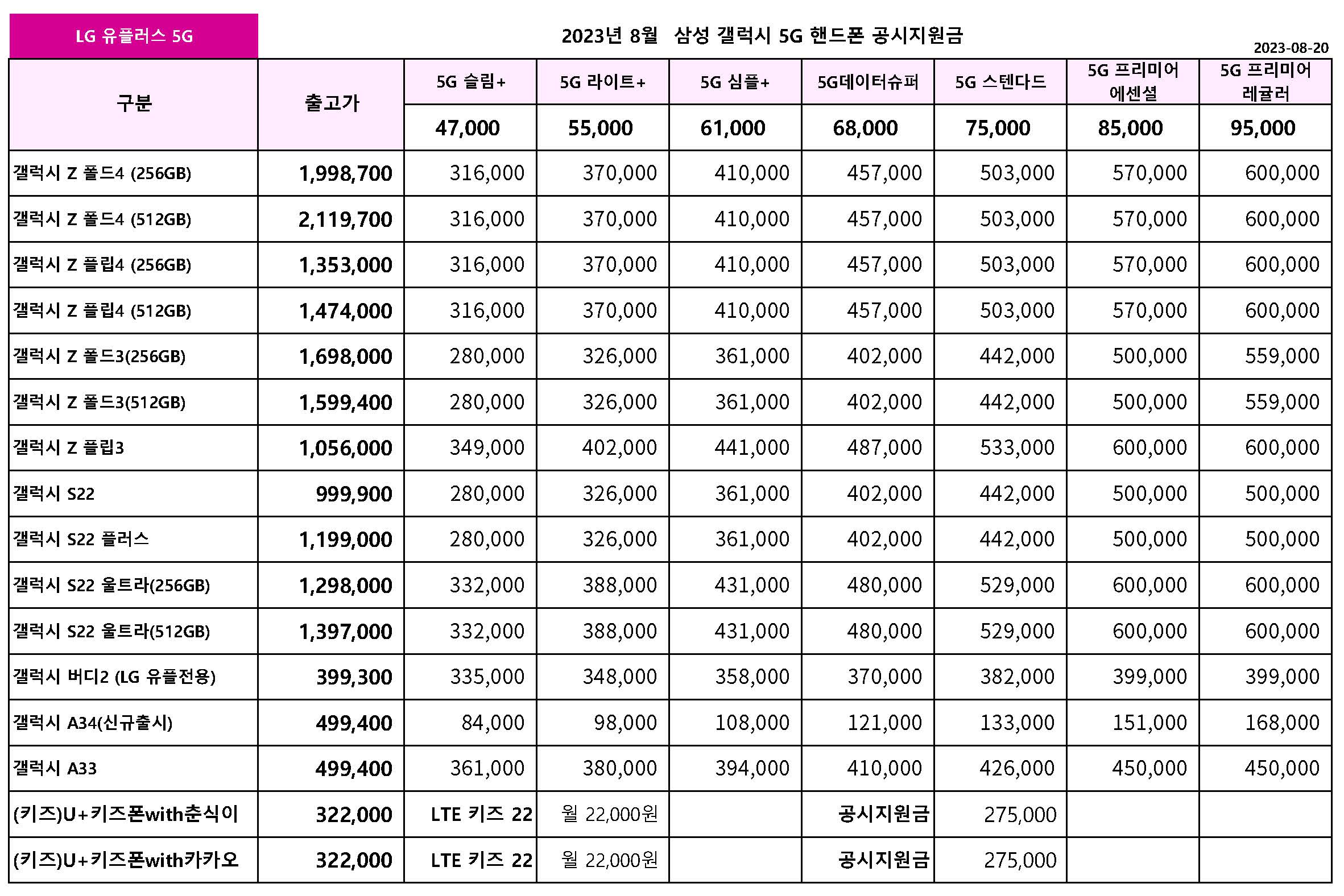 8월 LG유플러스 주요 핸드폰 공시지원금 정리 - 8월 20일 기준
