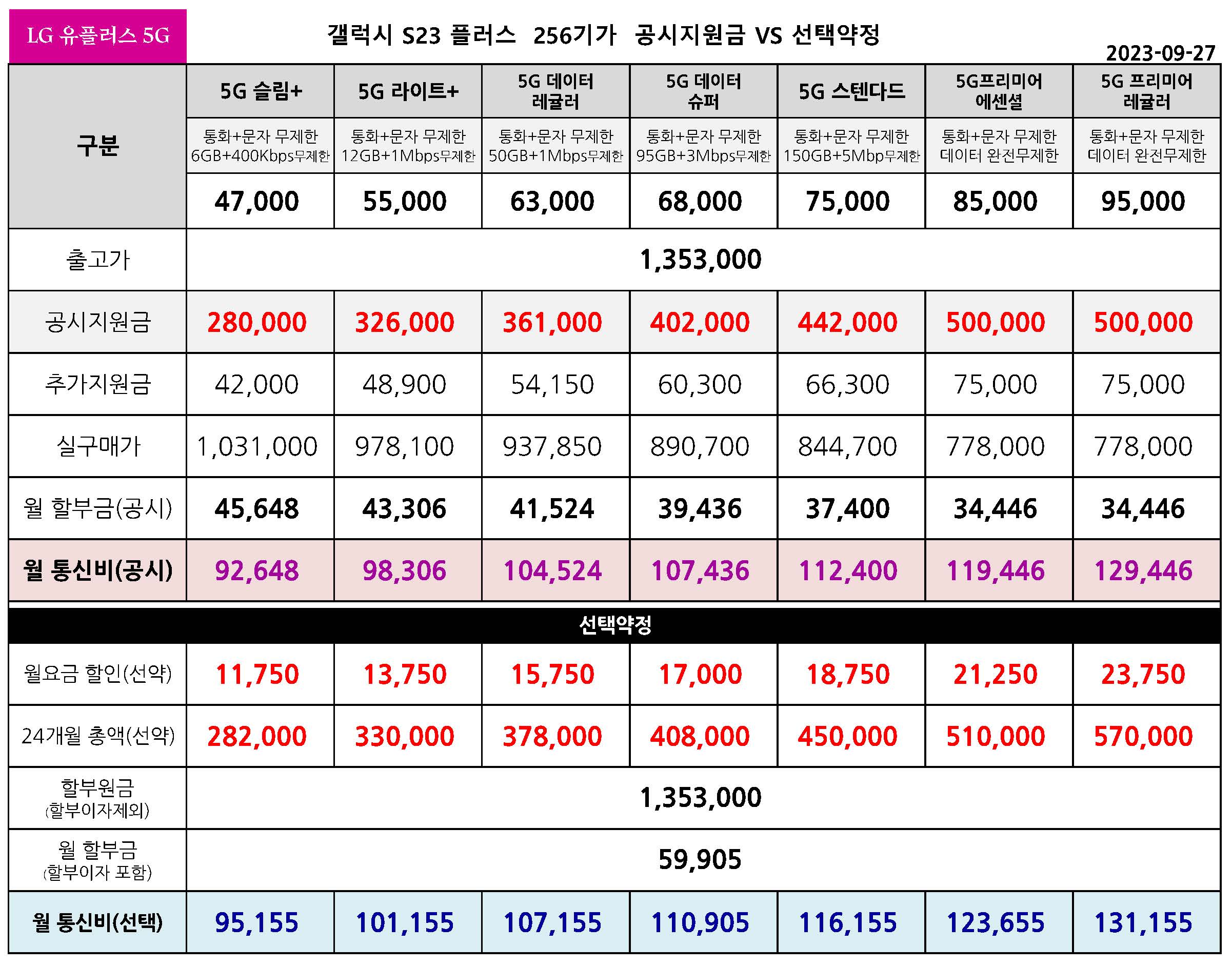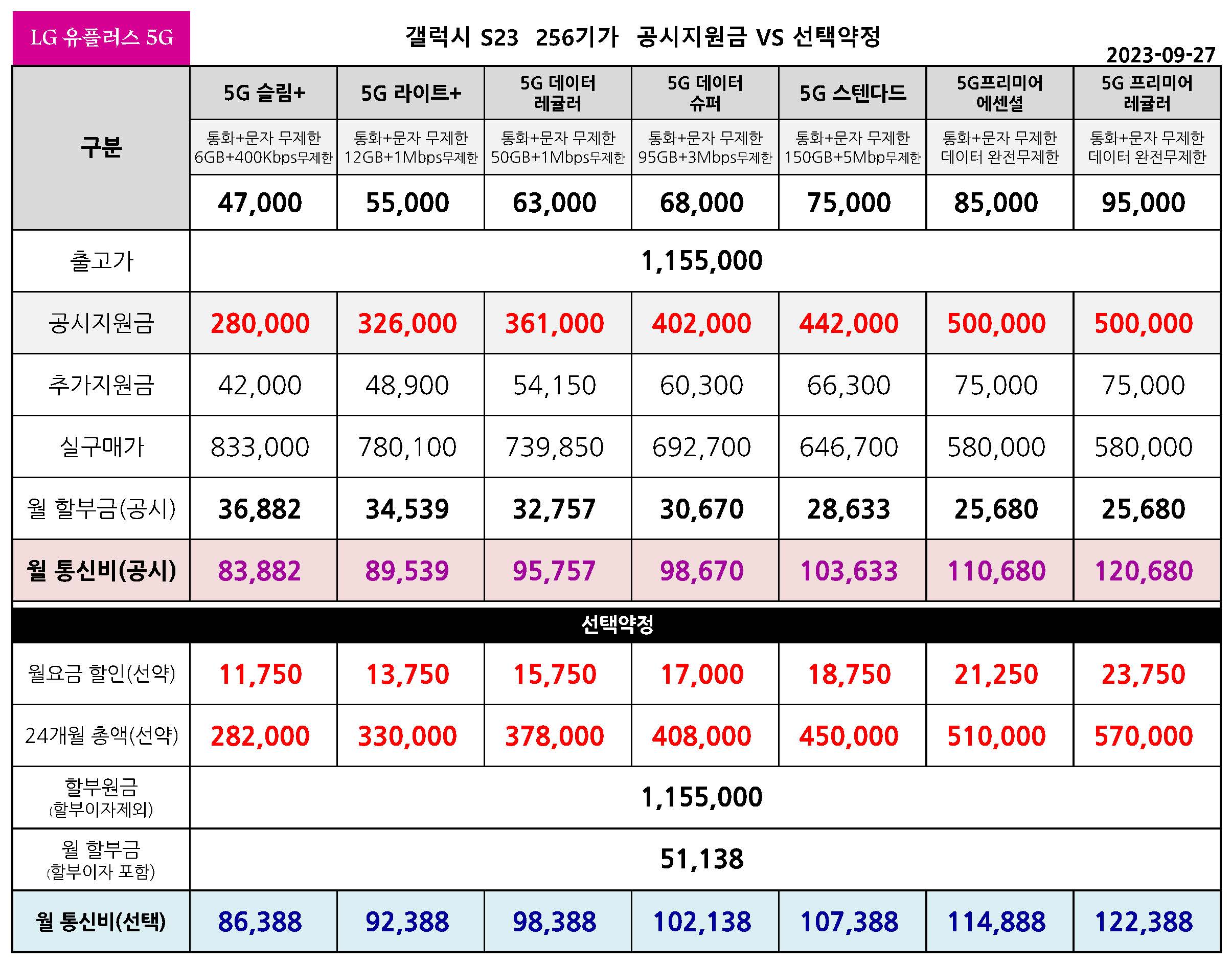 LG 유플러스 갤럭시 S23, S23+, S23 울트라 공시지원금 & 월 통신비 요금표