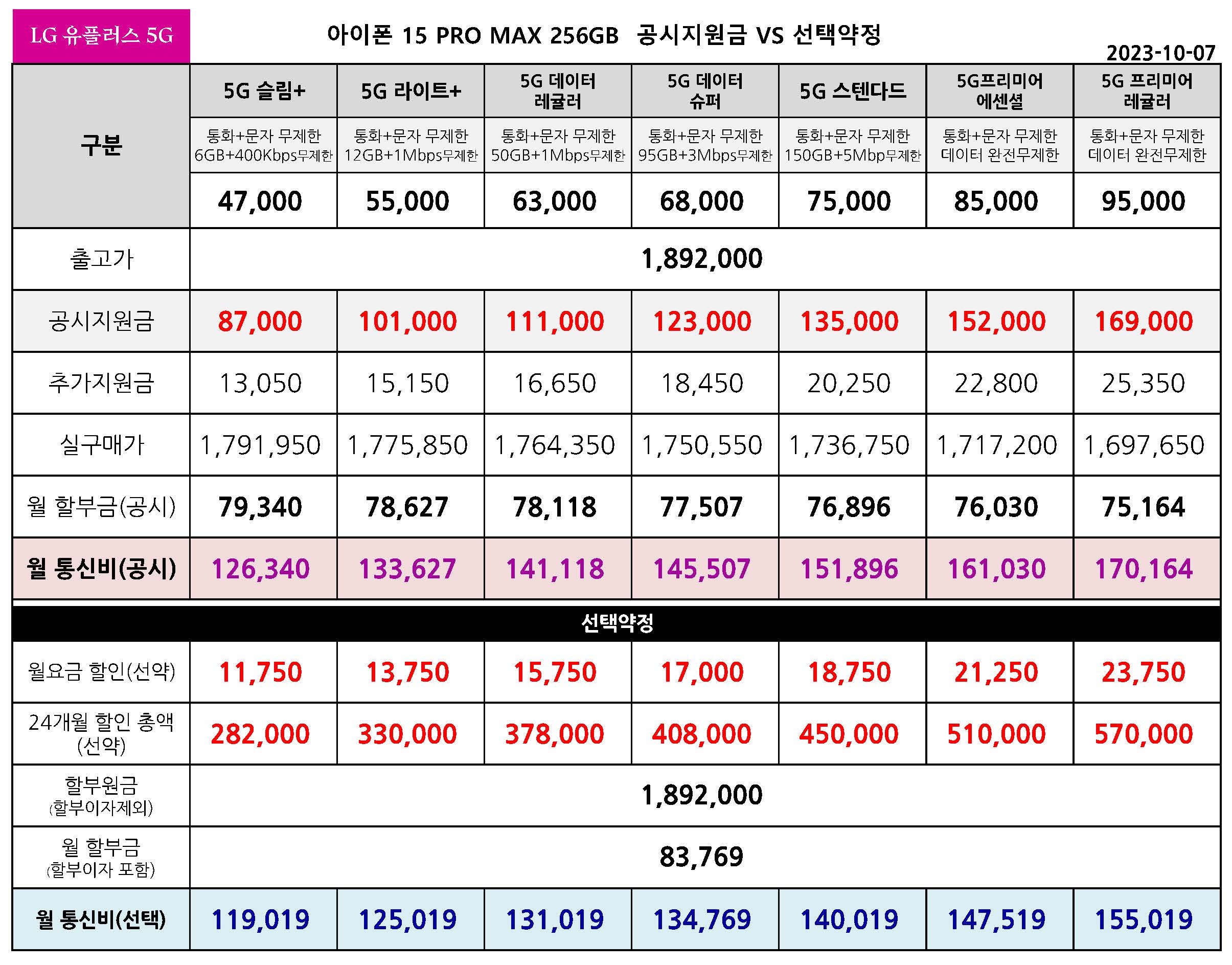 LG 유플러스 아이폰 15 PRO MAX 공시지원금 & 선택약정 월 통신요금표