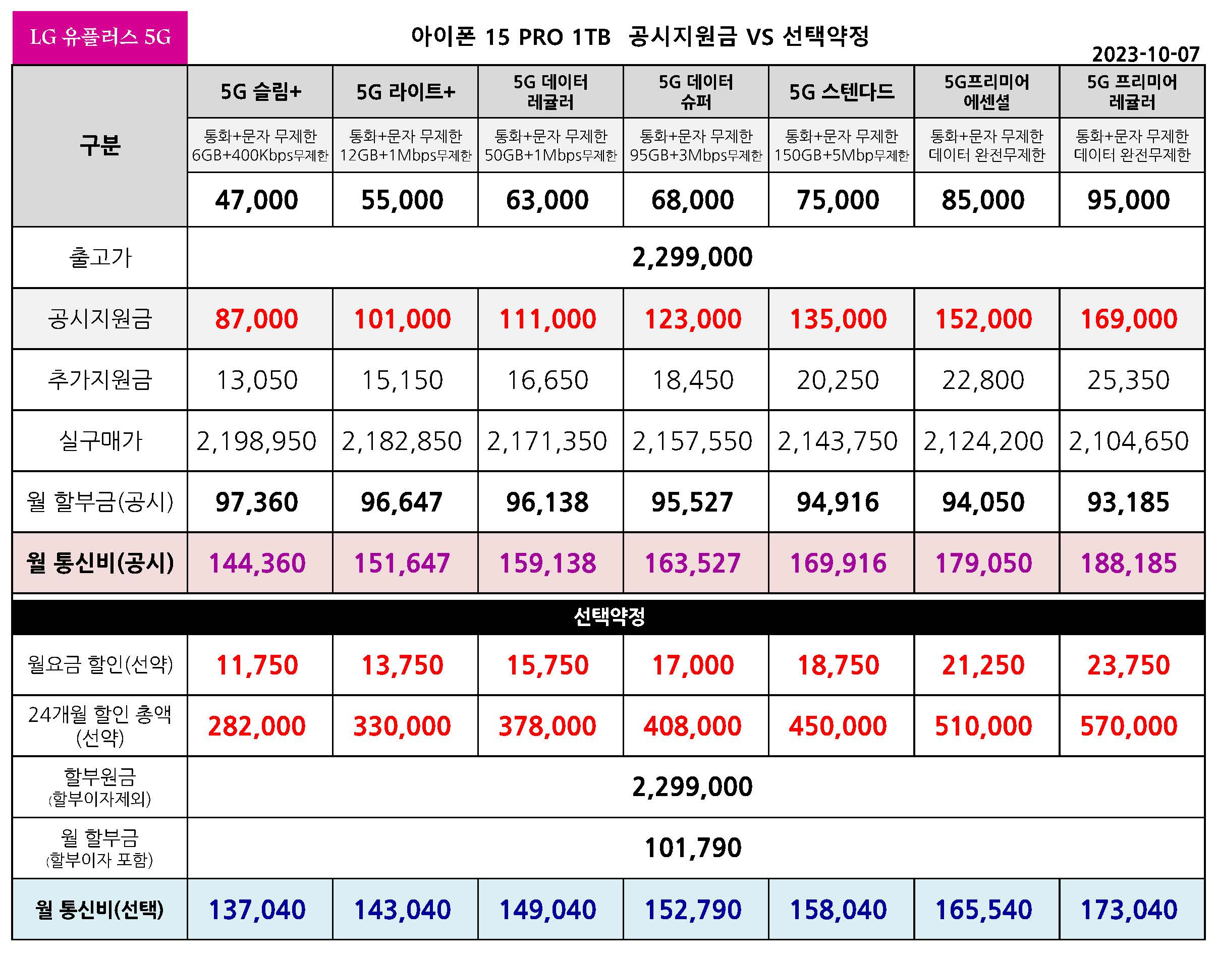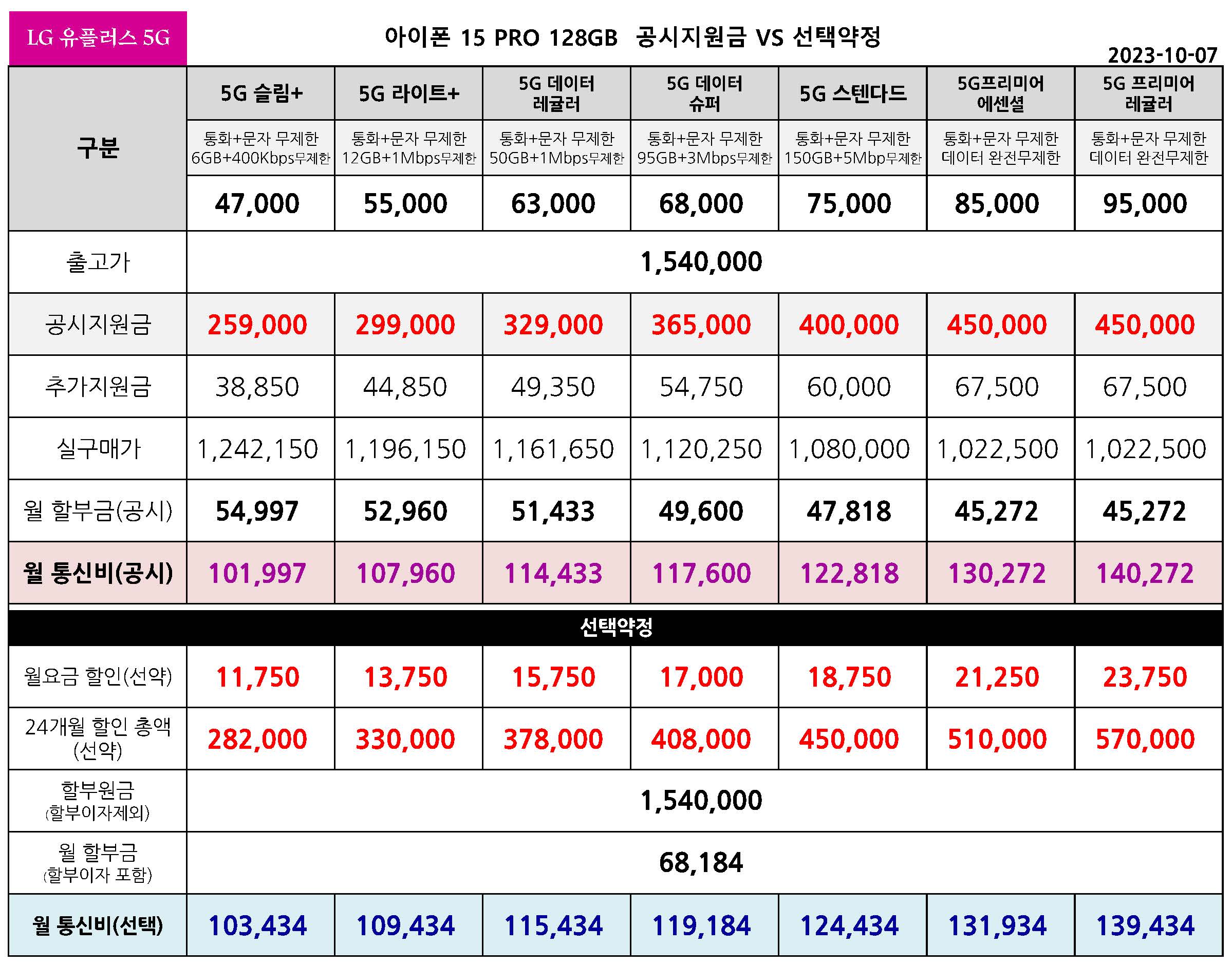 LG 유플러스 아이폰 15 PRO 공시지원금 & 선택약정 월 통신요금표