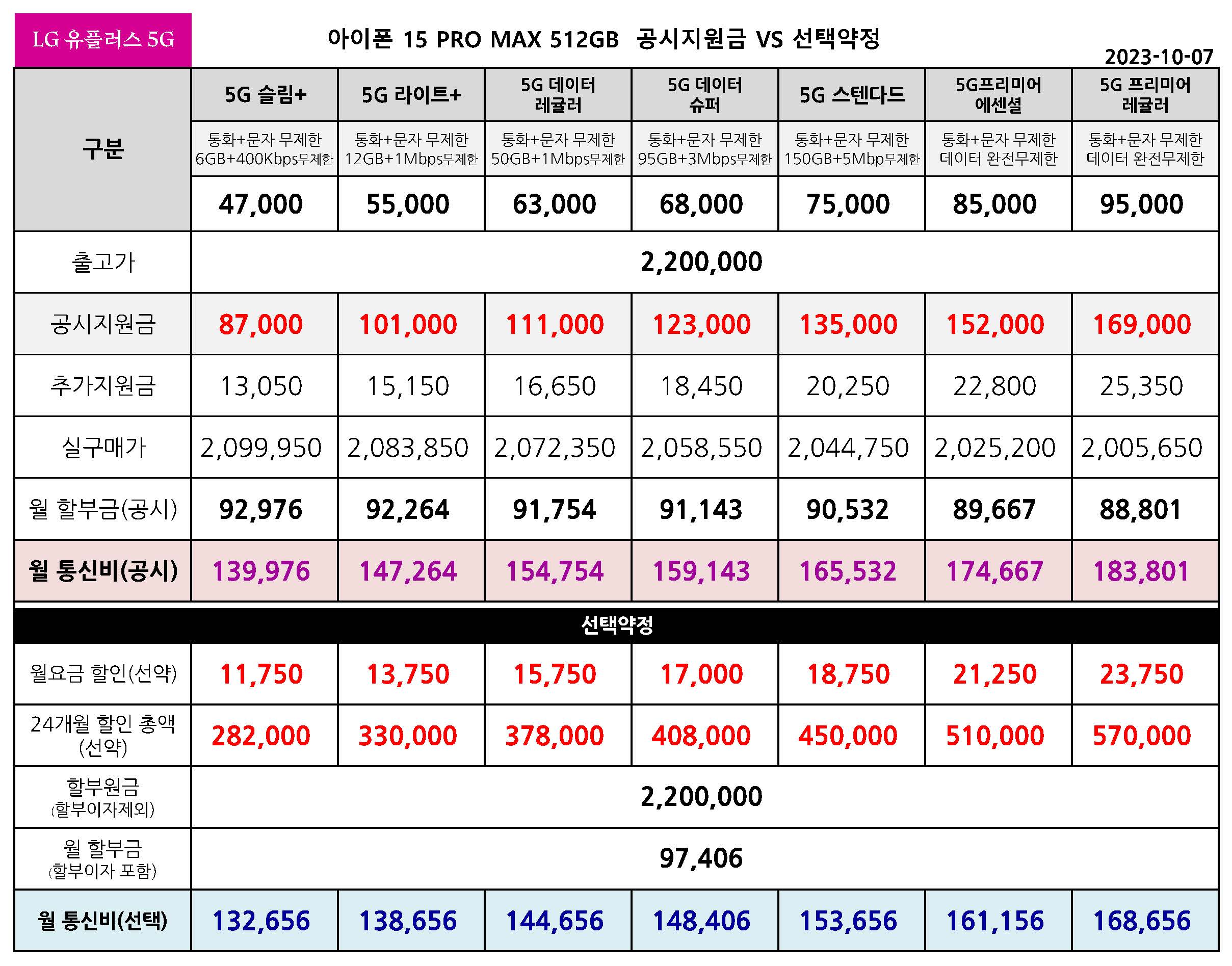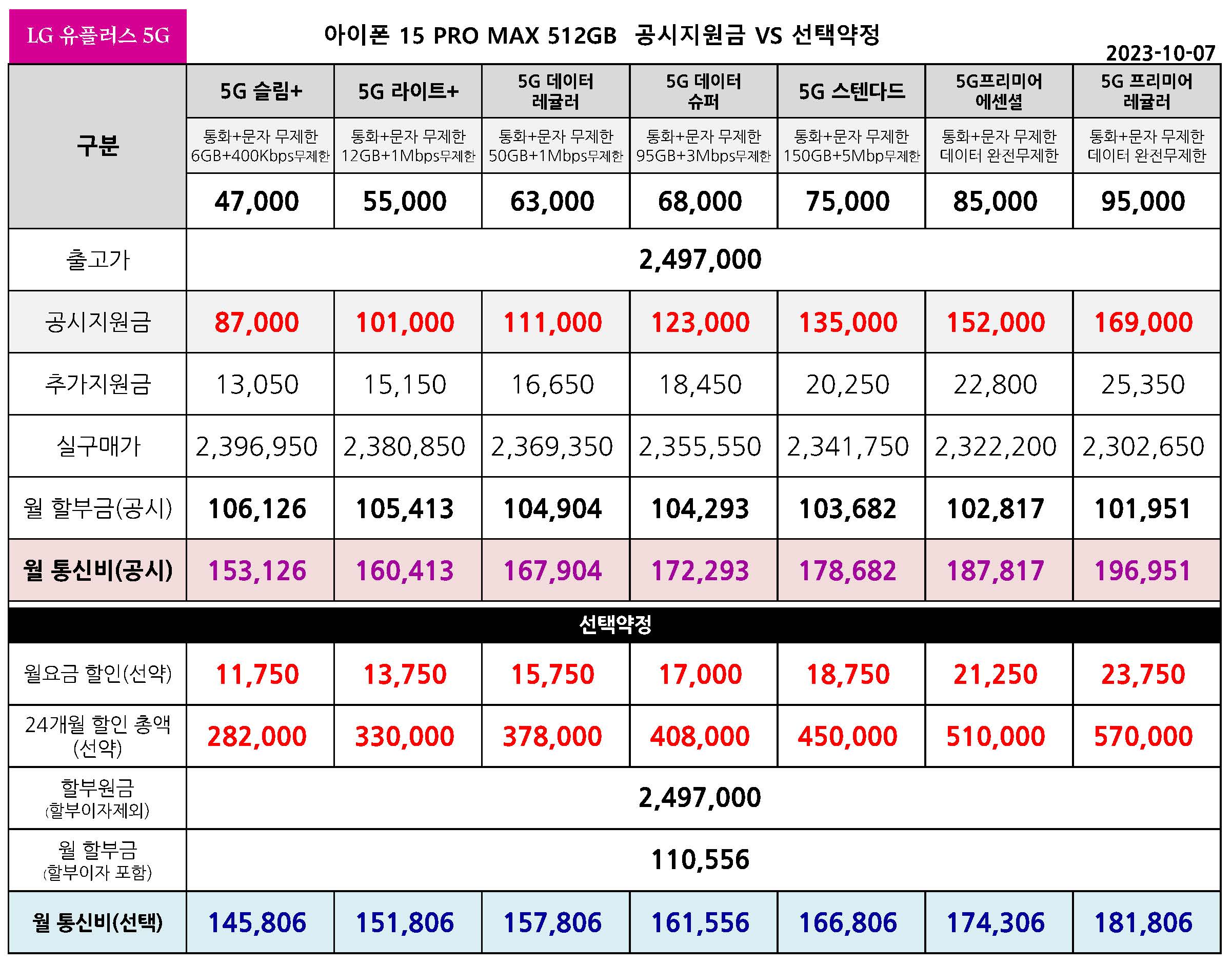 LG 유플러스 아이폰 15 PRO MAX 공시지원금 & 선택약정 월 통신요금표