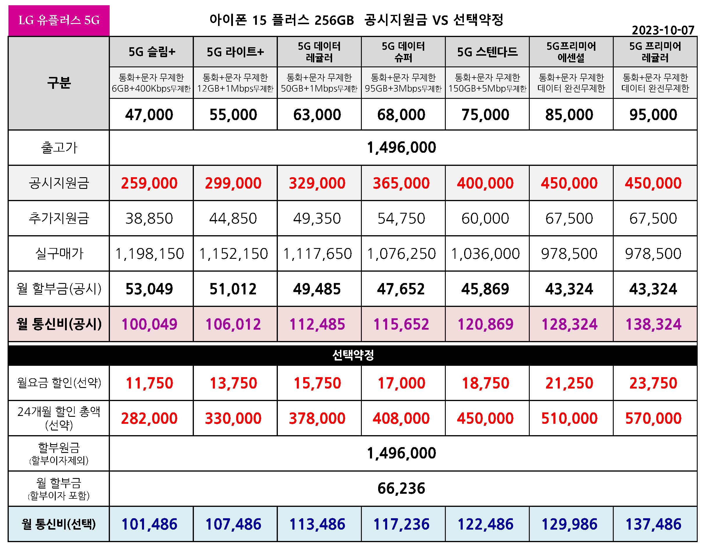 LG 유플러스 아이폰 15 플러스 시리즈 공시지원금 & 선택약정 월 통신요금표