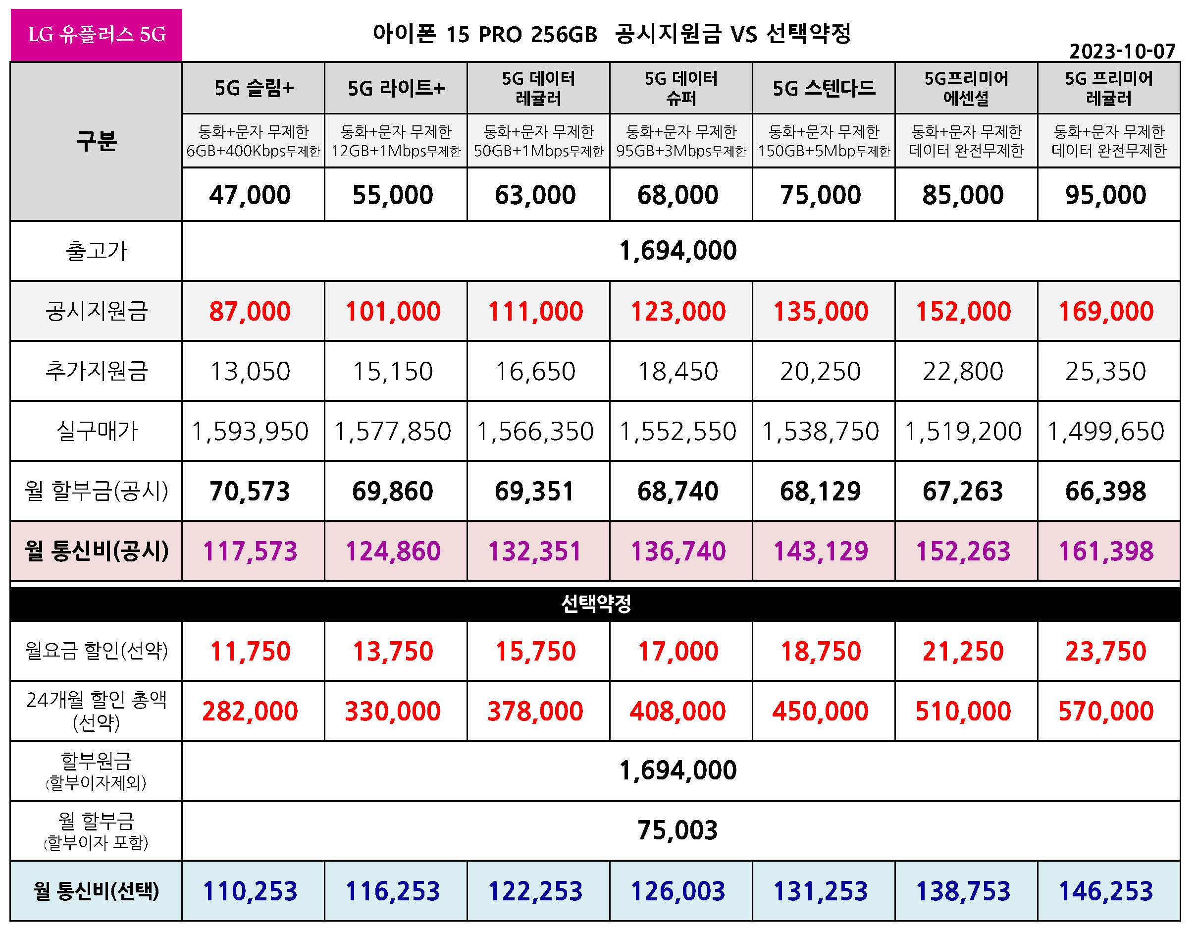 LG 유플러스 아이폰 15 PRO 공시지원금 & 선택약정 월 통신요금표