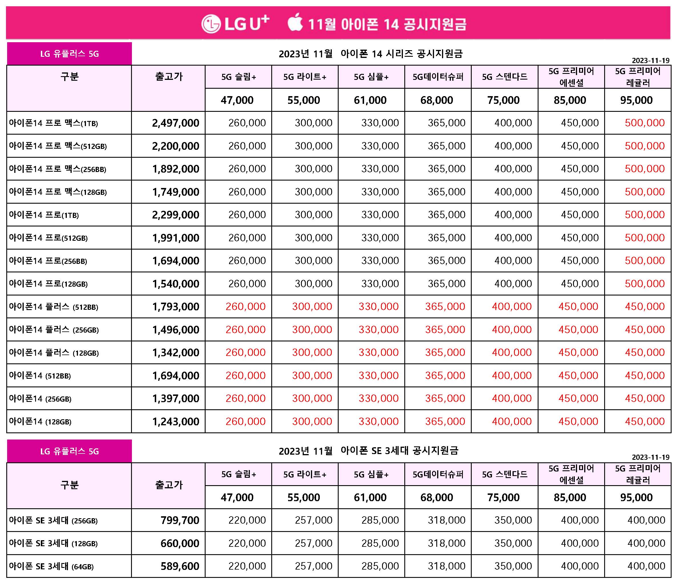 11월 LG 유플러스 주요 핸드폰 공시지원금 정리 - 11월 19일 기준