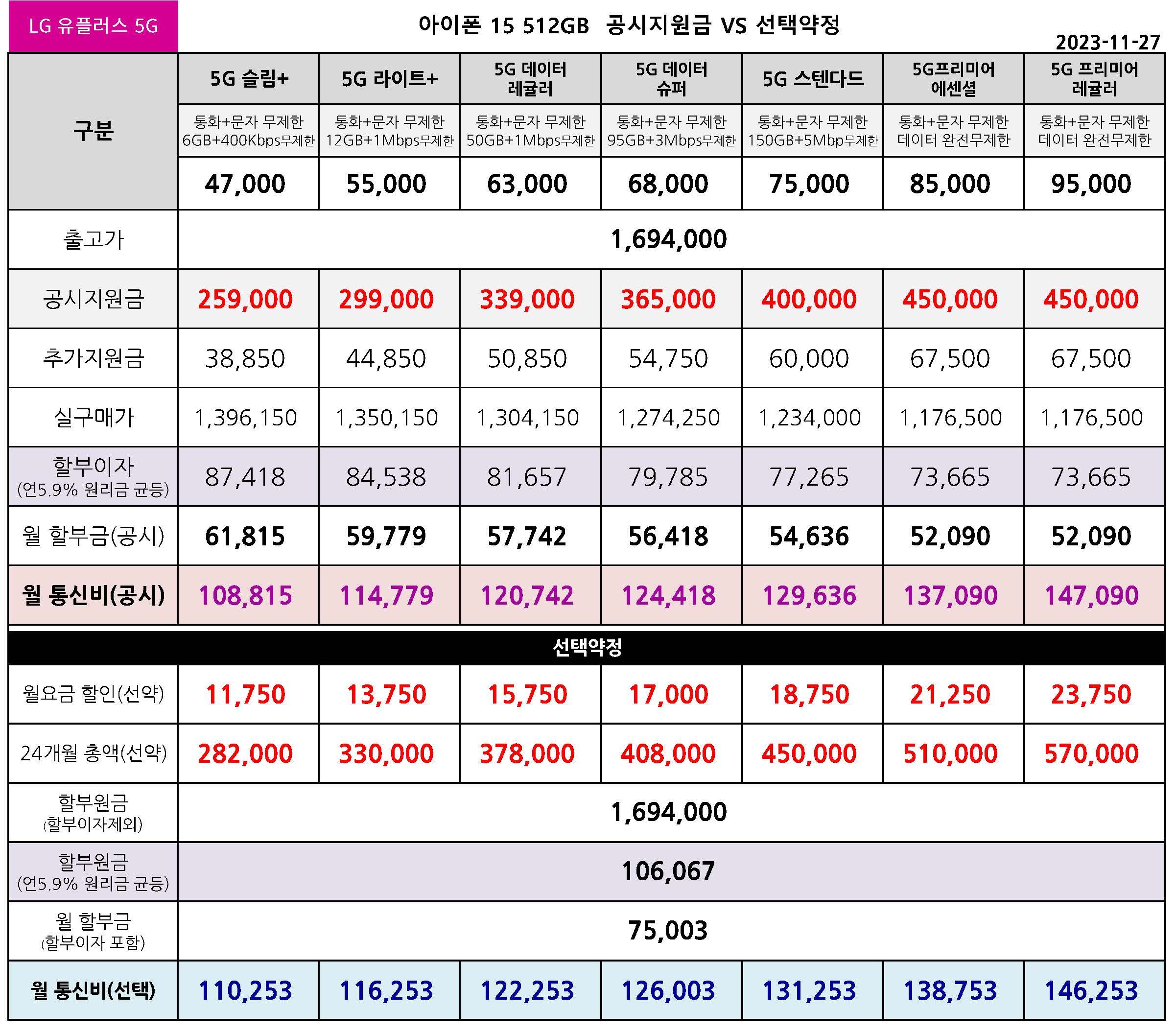 LG유플러스 15 공시지원금 & 선택약정 월 통신요금표 - 11월 27일기준~ 지원금 변경일까지