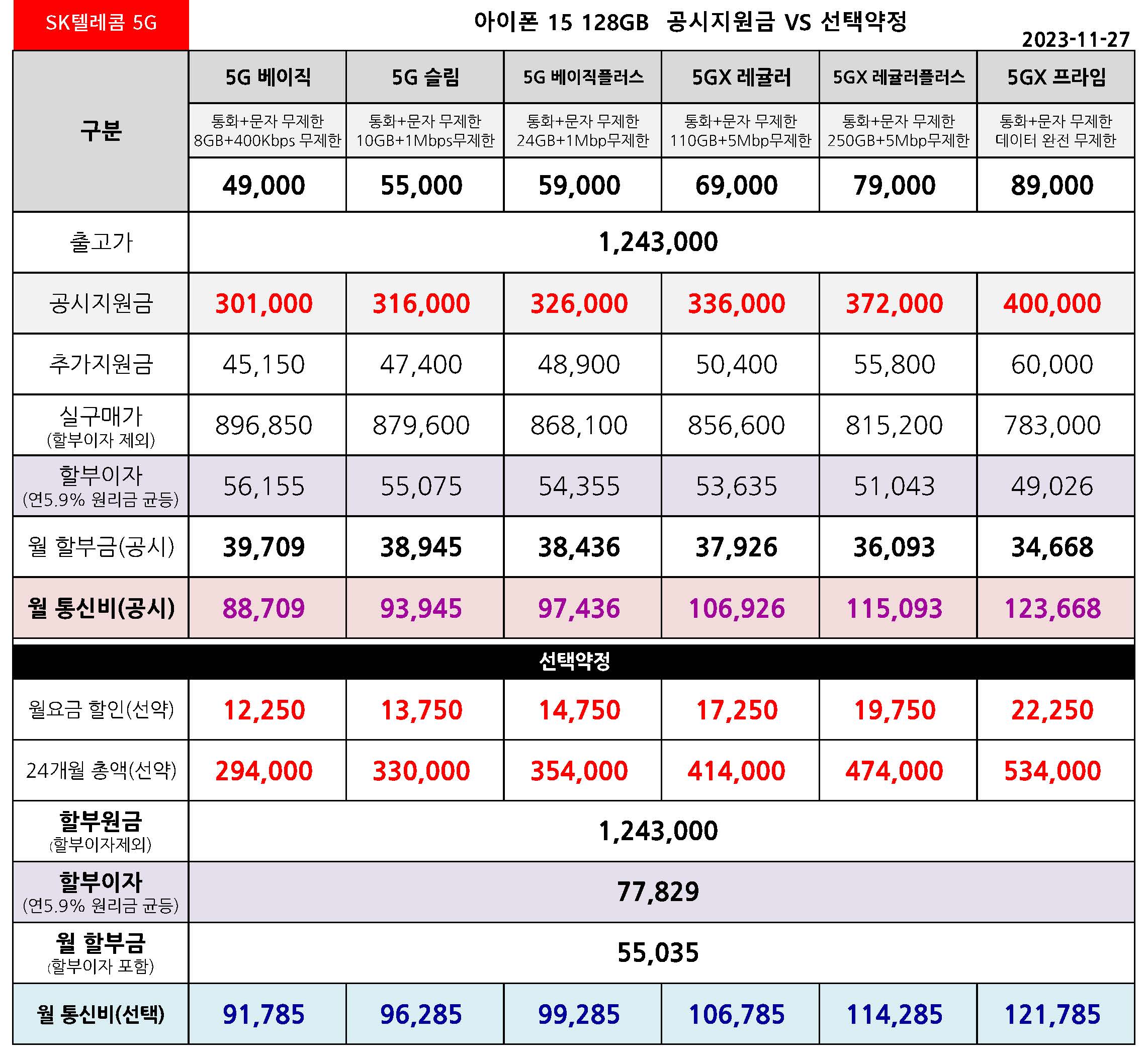 SK텔레콤 아이폰 15 공시지원금 & 선택약정 월 통신요금표 - 11월 27일기준 공시지원금 변경일까지