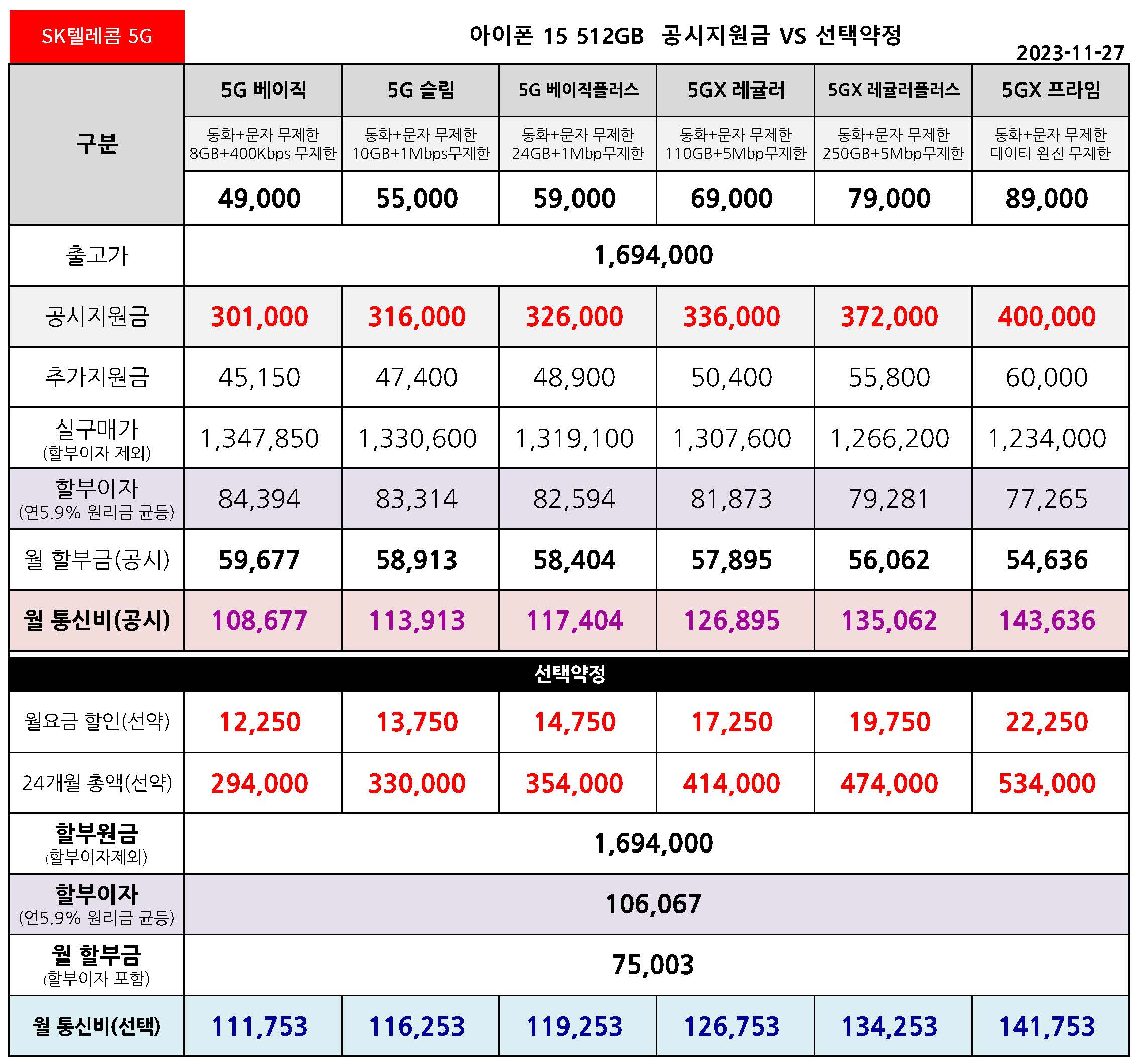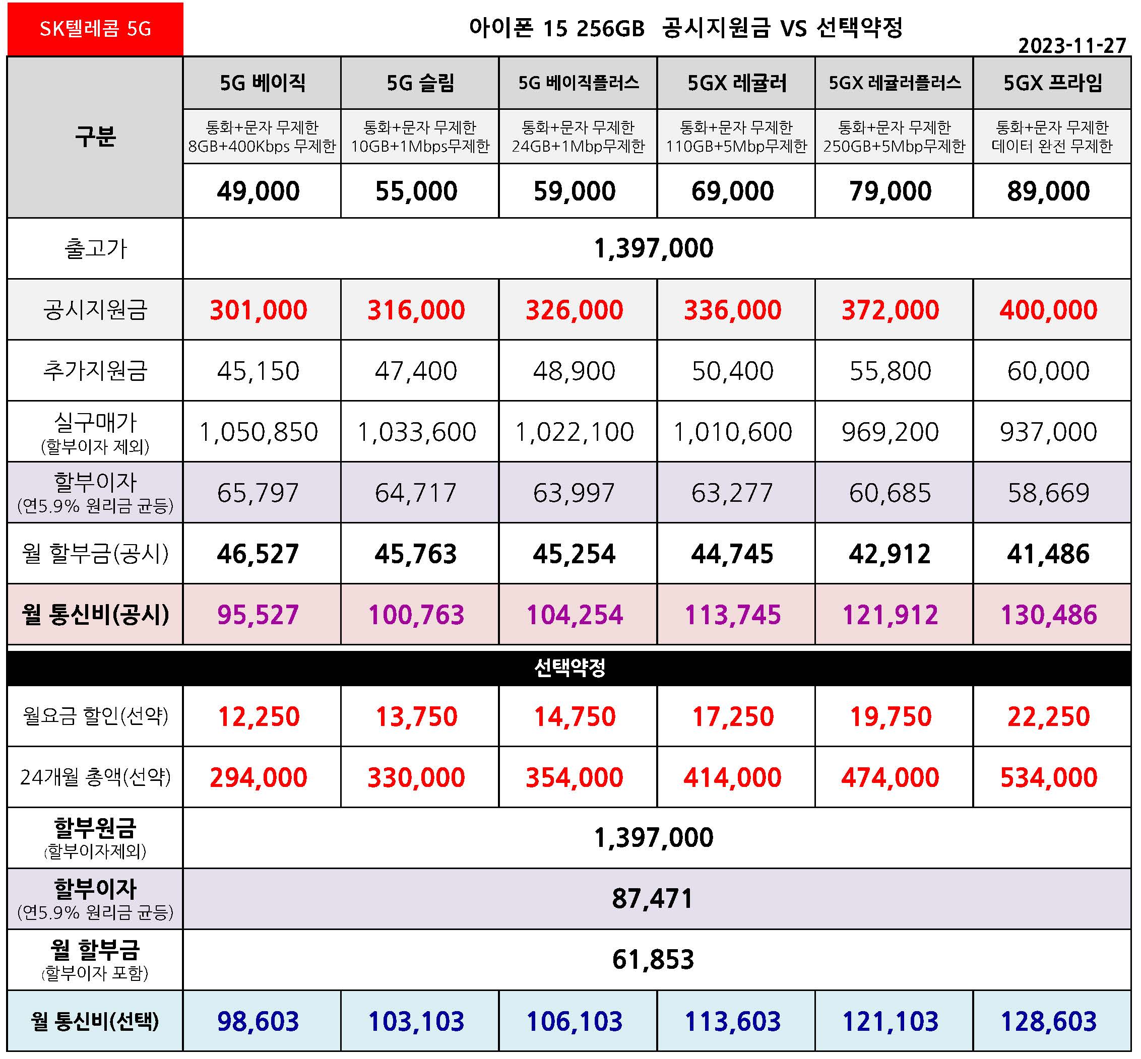 SK텔레콤 아이폰 15 공시지원금 & 선택약정 월 통신요금표 - 11월 27일기준 공시지원금 변경일까지