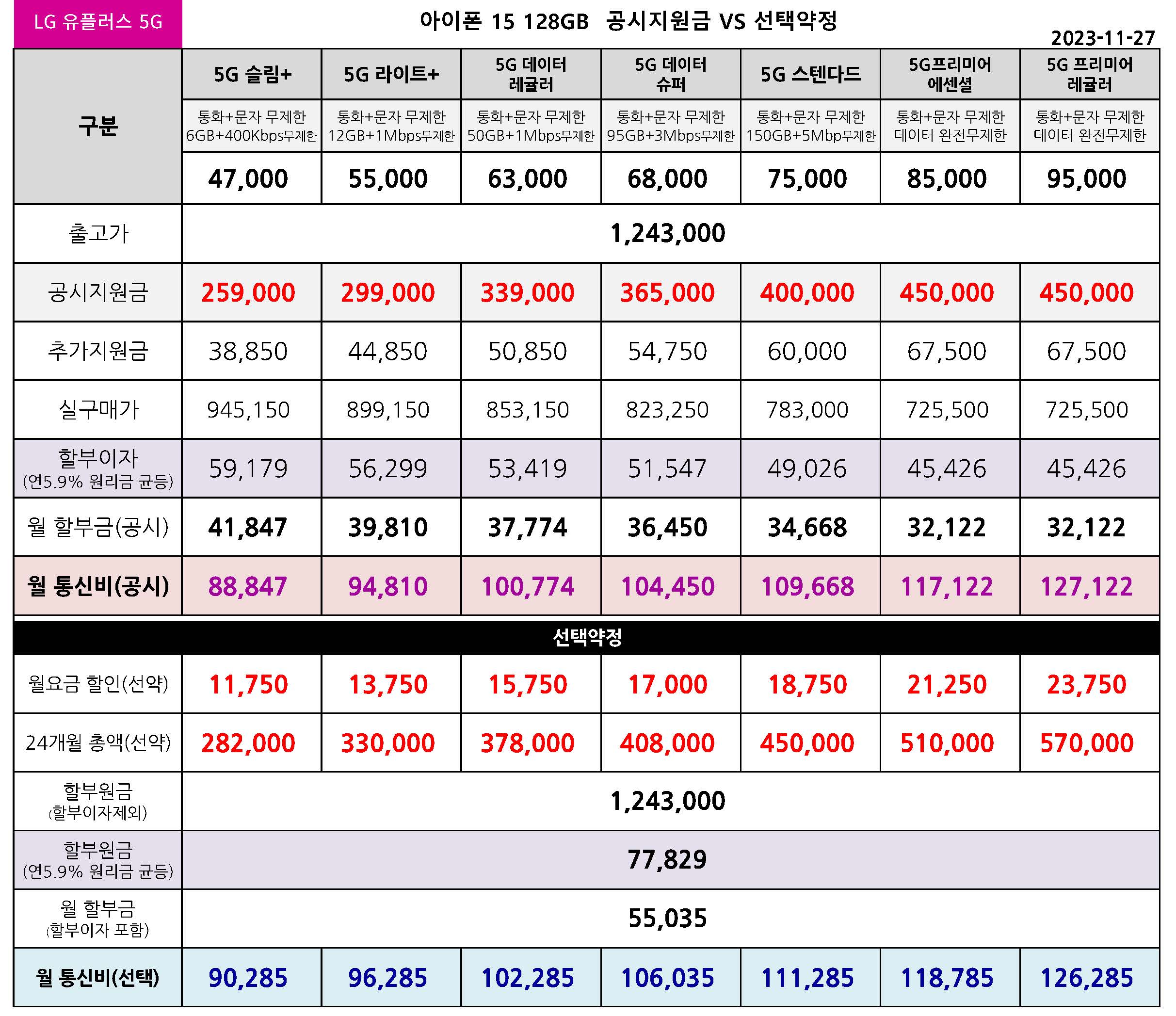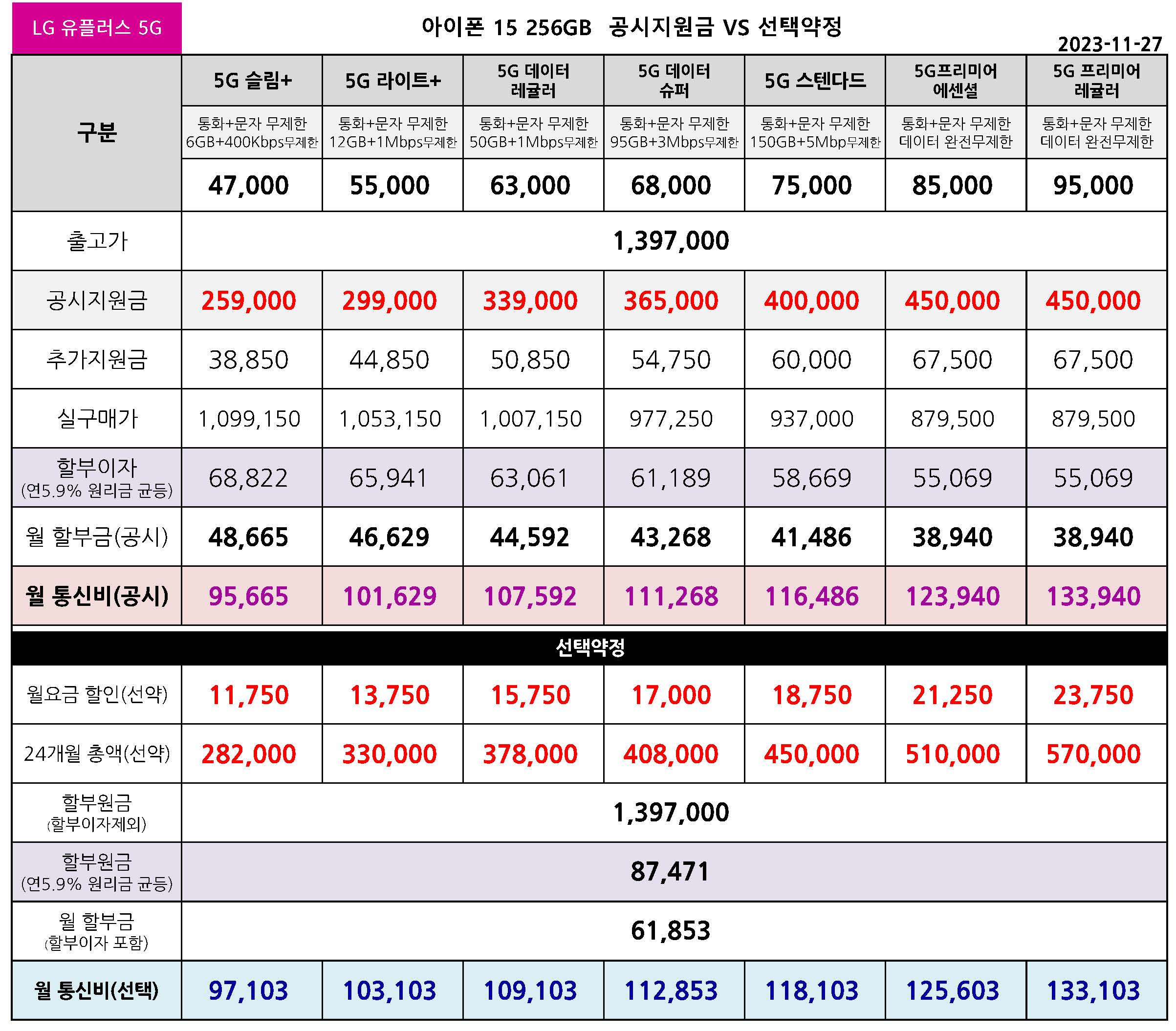 LG유플러스 15 공시지원금 & 선택약정 월 통신요금표 - 11월 27일기준~ 지원금 변경일까지