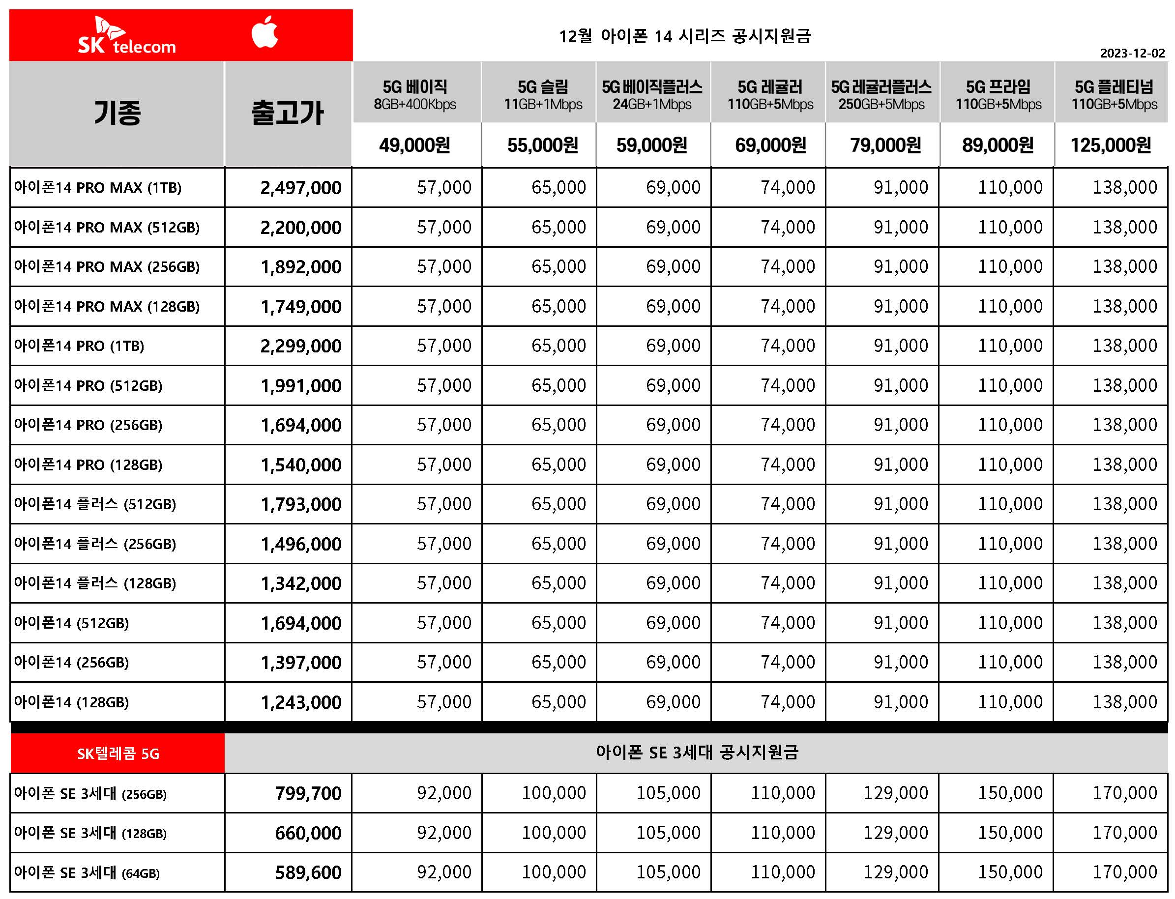 12월 SK텔레콤 아이폰 14 시리즈 / 아이폰 SE 3세대 공시지원금
