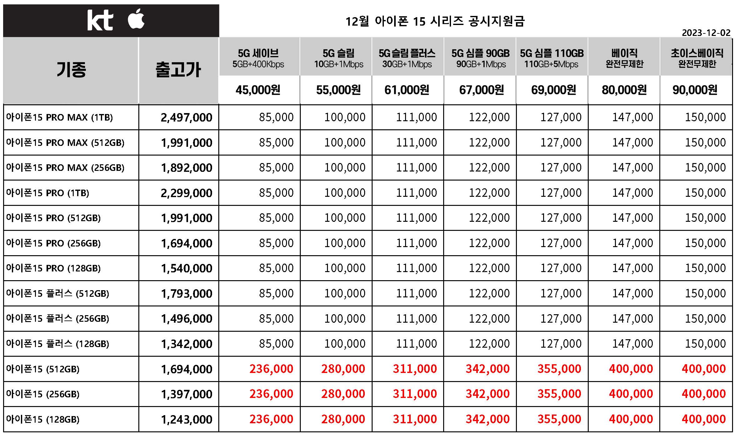 12월 KT 아이폰 15 시리즈 공시지원금 - 12월 2일 기준