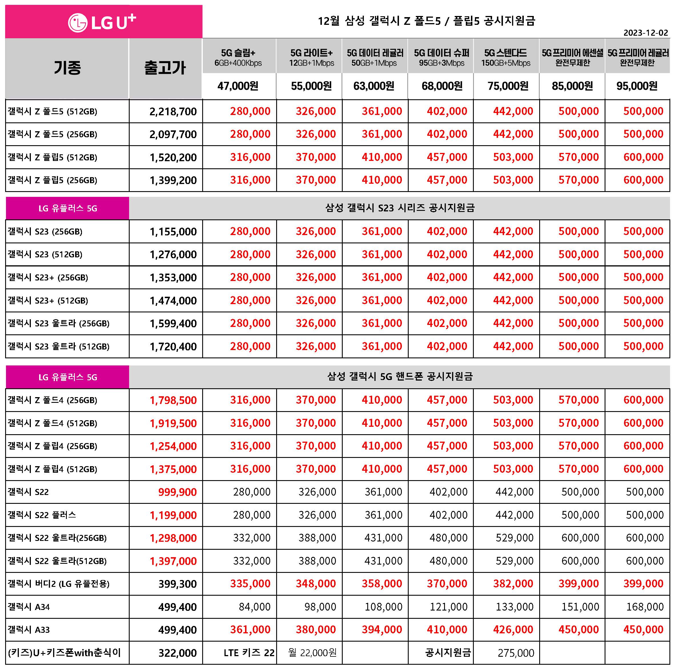 12월 2일 기준 LG 유플러스 주요 핸드폰 공시지원금입니다.