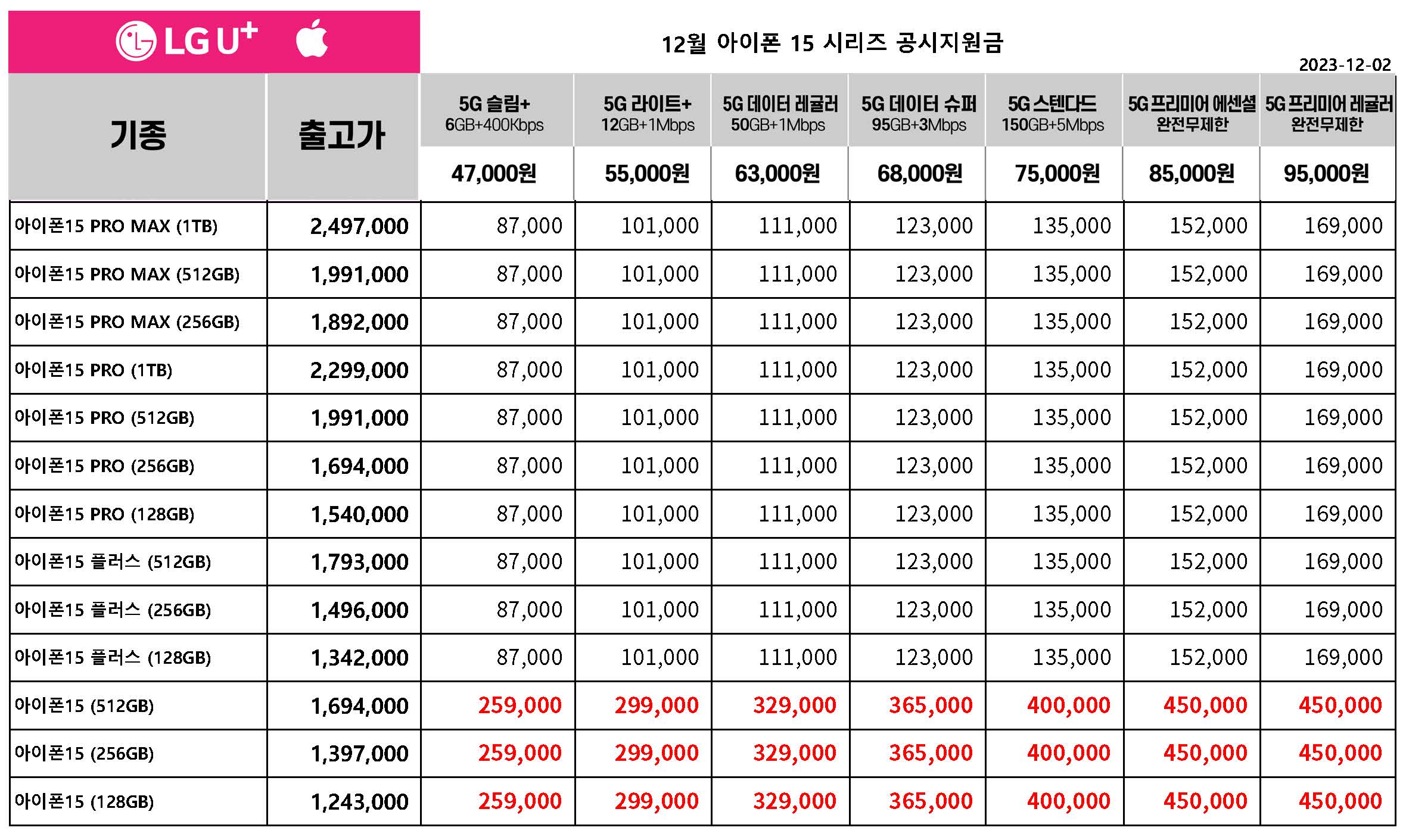 12월 LG 유플러스 아이폰 15 시리즈 공시지원금