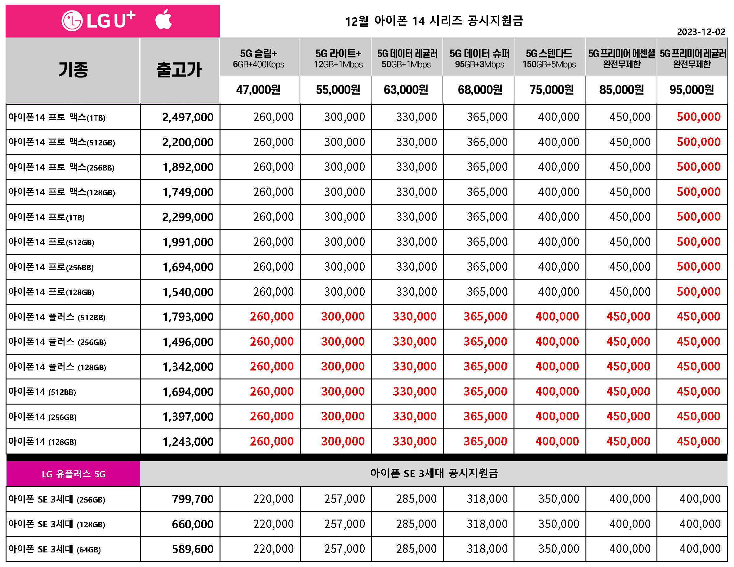 12월 LG 유플러스 아이폰 14 시리즈 / 아이폰 SE 3세대 공시지원금
