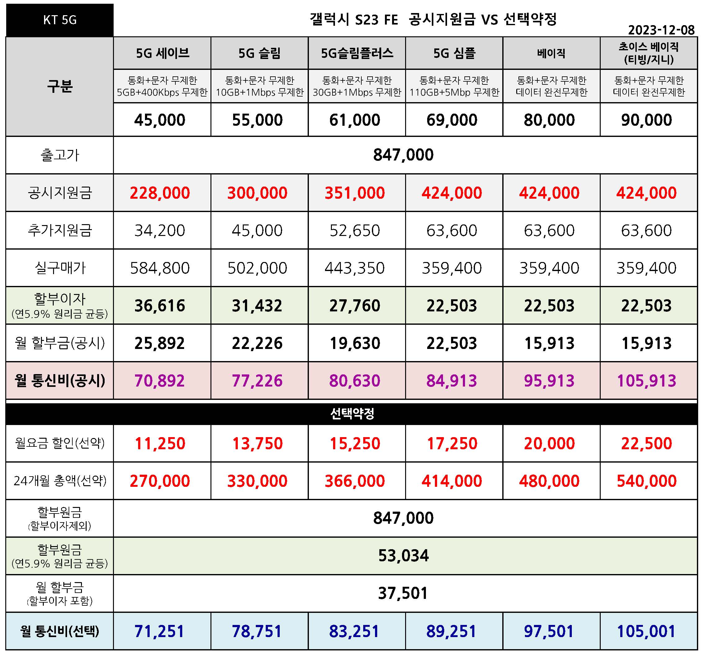 KT 갤럭시 S23 FE 공시지원금 & 선택약정 월 통신요금표