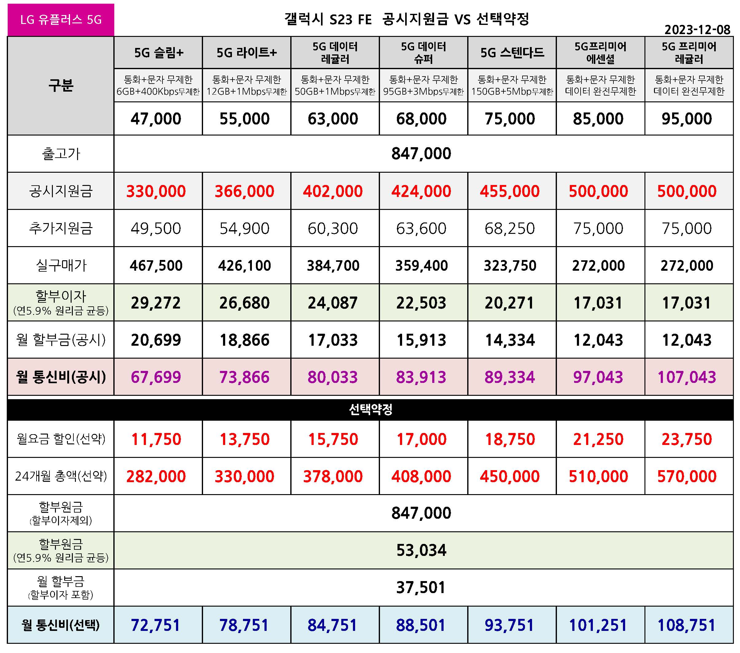 LG 유플러스 갤럭시 S23 FE 공시지원금 & 선택약정 월 통신요금표