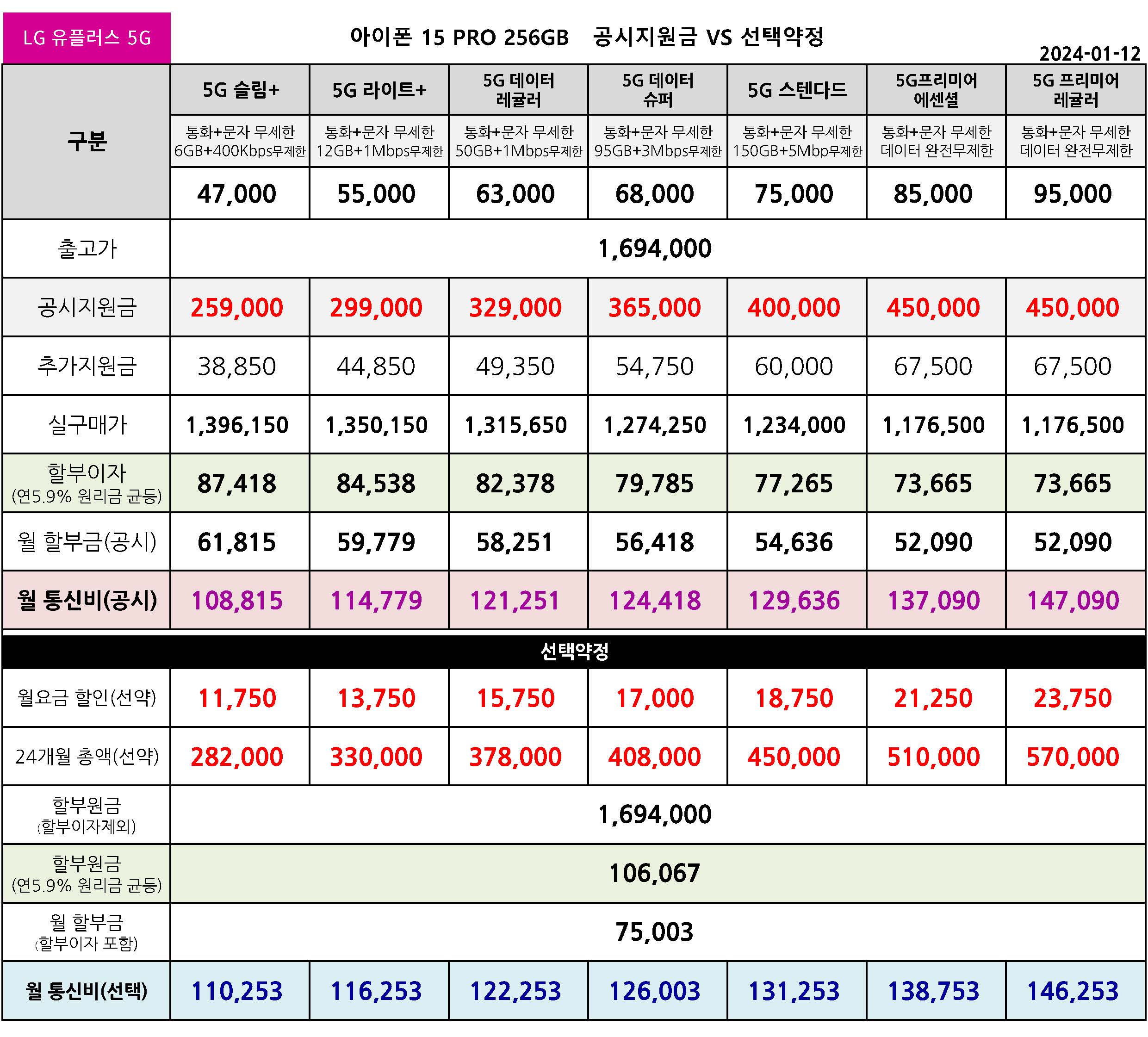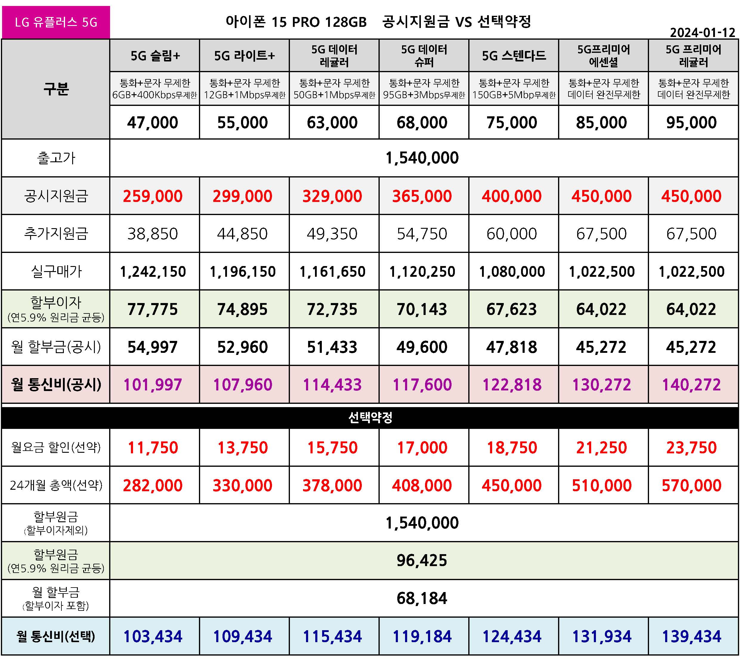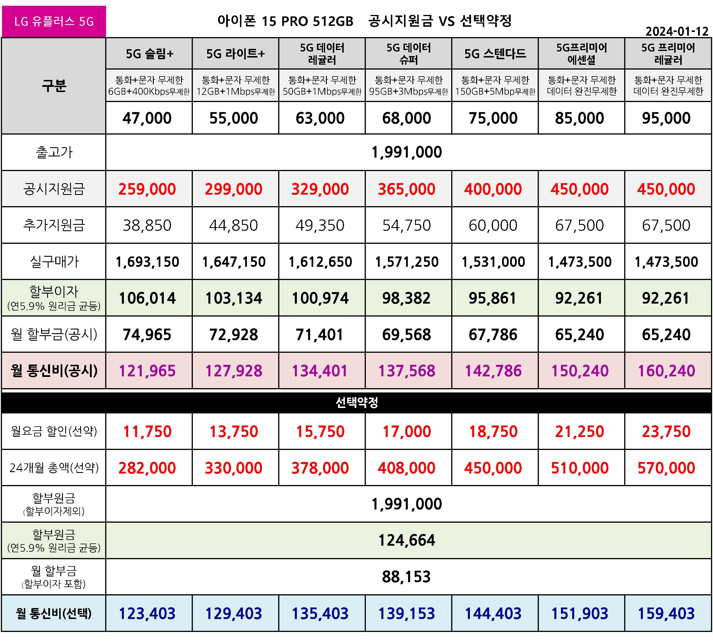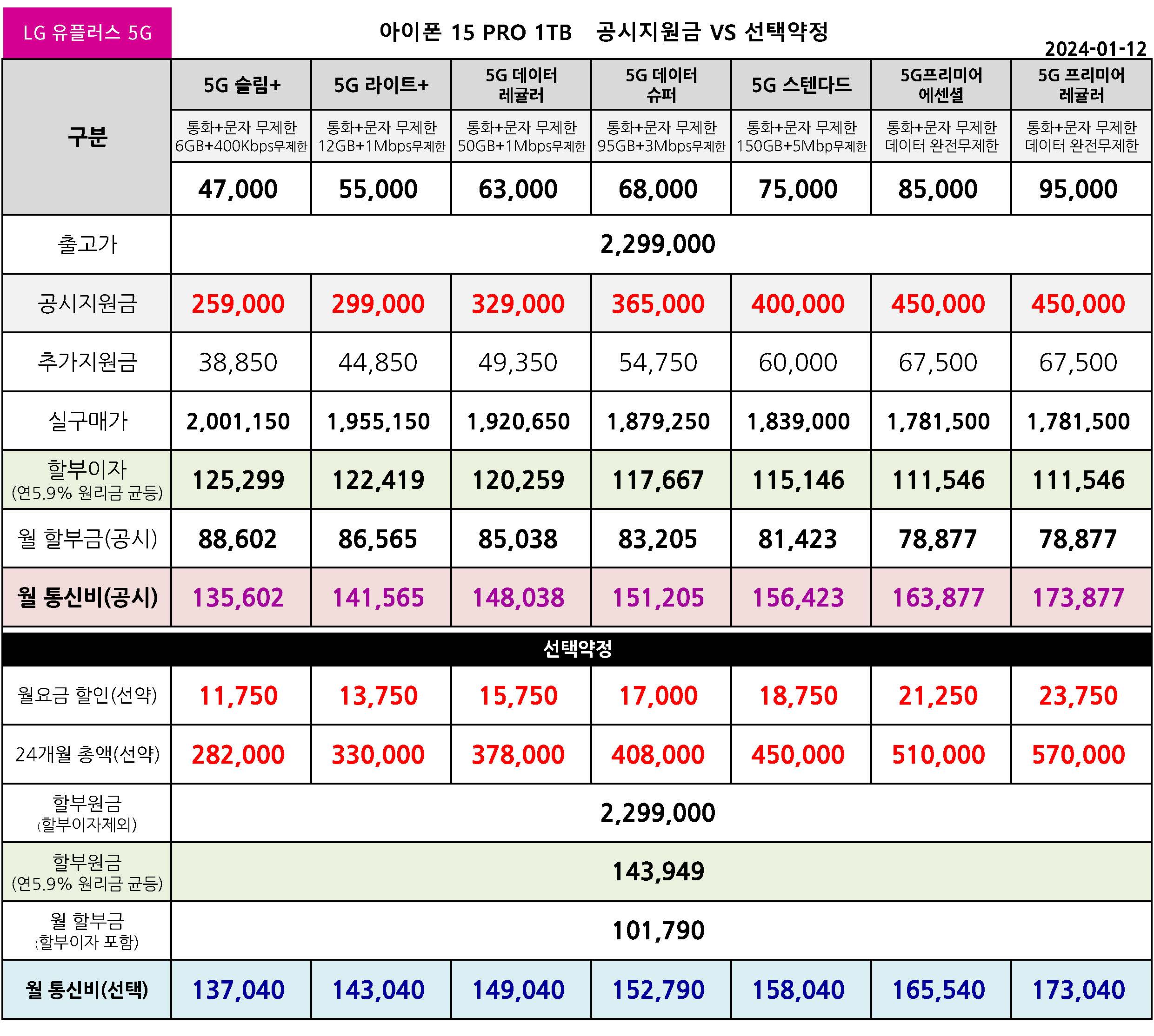LG유플러스 아이폰 15 프로 128/256/512/1TB 공시지원금 월 통신 요금표 - 1월 12일 기준