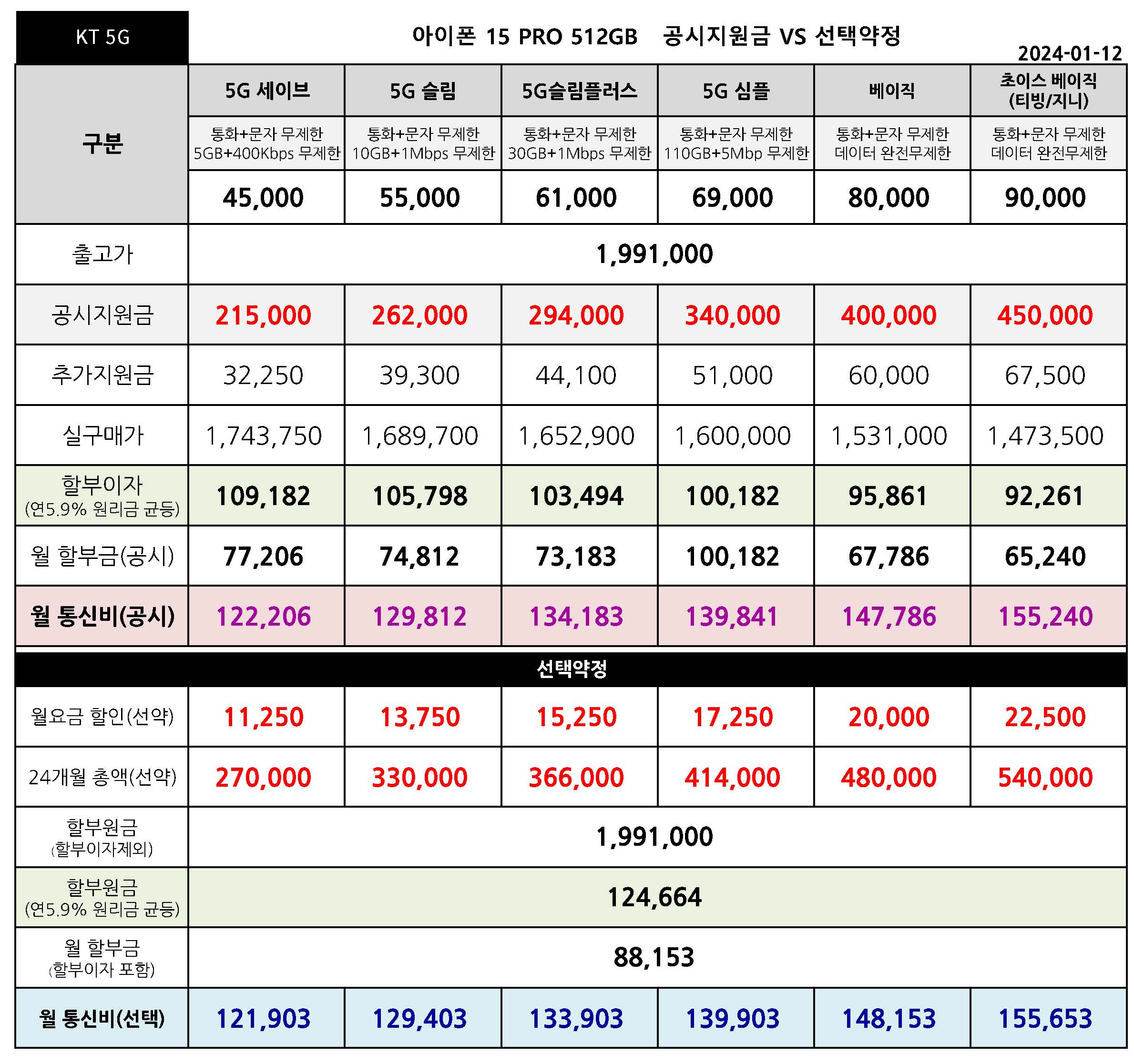 KT 아이폰 15 프로 128/256/512/1TB 공시지원금 월 통신 요금표 - 1월 12일 기준